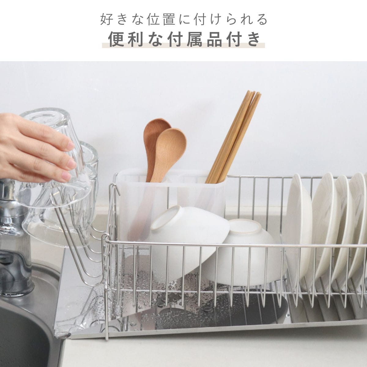 水切りラックに比べて少し長めに設計されたトレーは、グラスホルダーに掛けたグラスやマグボトルから落ちた水滴もしっかりキャッチしてくれます。