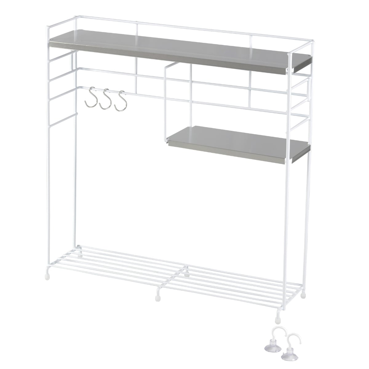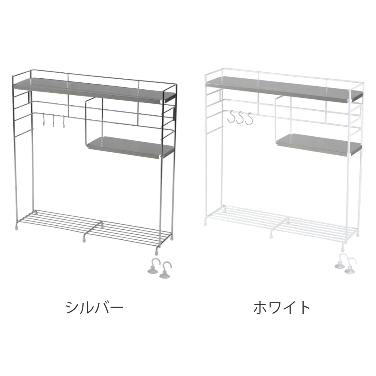 | 材質 | 本体:スチール(表面加工:シルバー/クロムメッキ、ホワイト/ポリエチレン樹脂コーティング) 天板・棚板:18-0ステンレス 脚ゴム:シリコーンゴム フック付き吸盤:ポリエチレン樹脂・塩化ビニル 補助版:PET |
