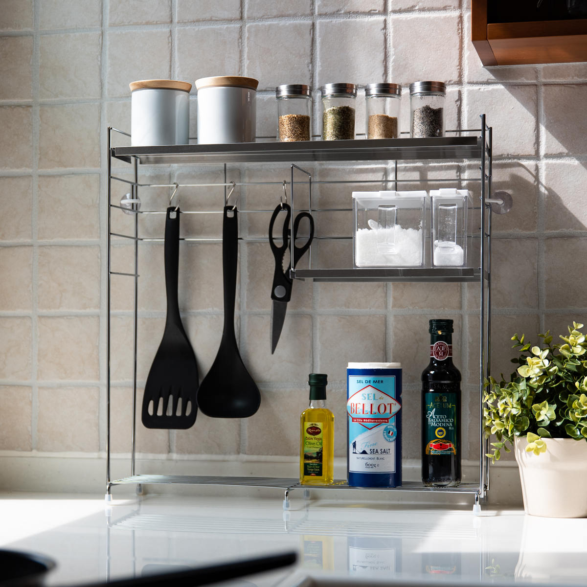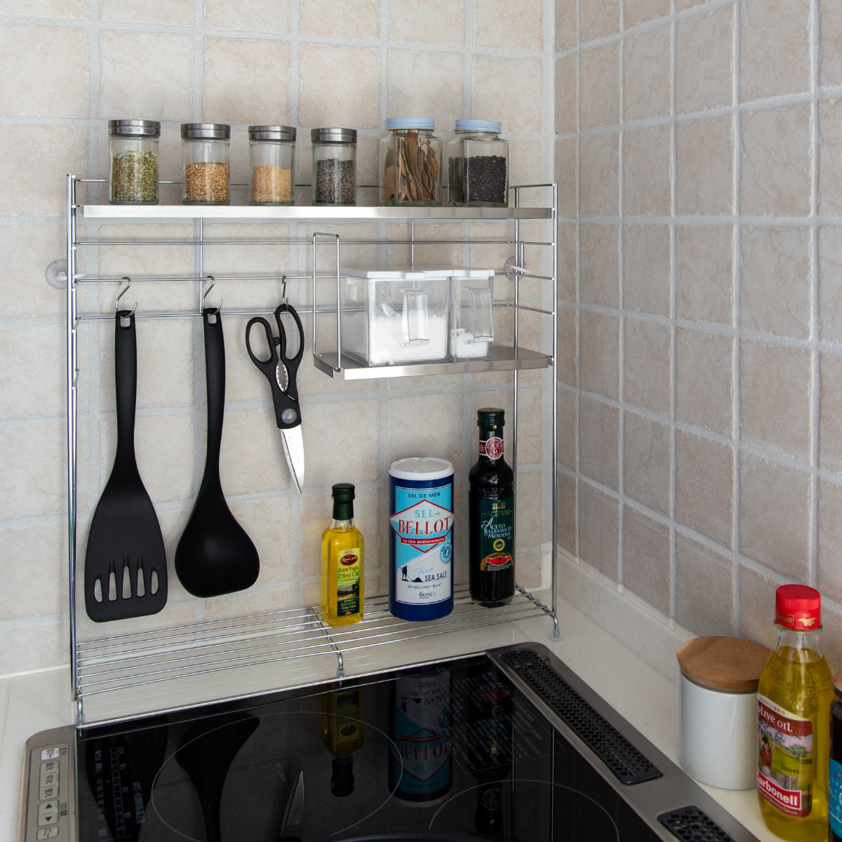 奥行きがスリムなラックはキッチンの作業台に置いても邪魔になりません。ラックの脚にはシリコーンゴムが付いているので傷がつく心配もなく安心です。収納スペースを確保しつつ、より効率的な調理動線を作ることができます。