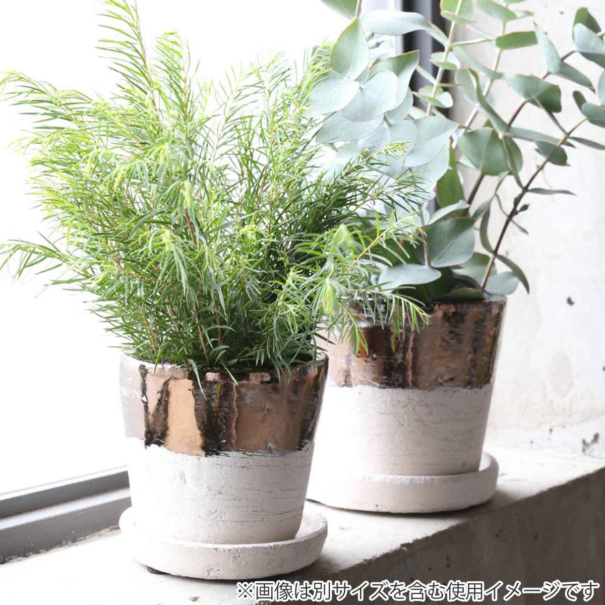 素材を生かしたベーシックな色と華やかなブロンズのツートンカラーが魅力のポット(M)です。テラコッタ素材は通気性が良く、ソーサーも付いているので、室内でオブジェとしても楽しめます。