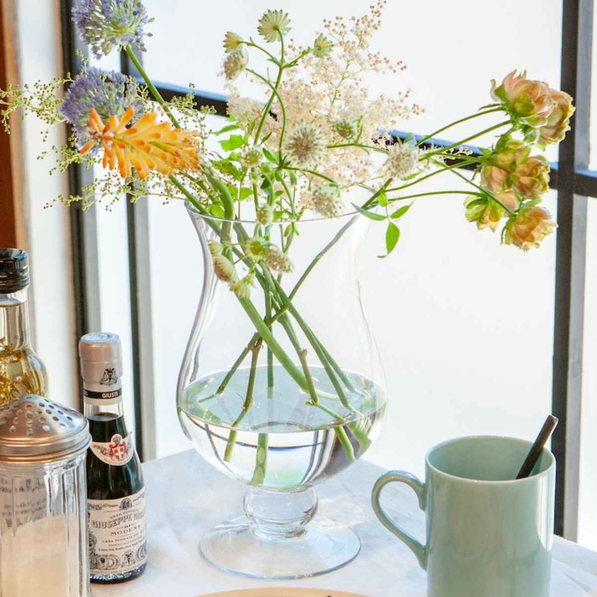 カジュアルスタイルのワイングラスを大きくしたかのような、ガラスベースです。キュッと締まったくびれが、さり気なくセクシーで色っぽいデザインです。中に収めた物の魅力を引き出すシンプルなフォルムなので、プロのデコレーターやコーディネーターの方にも人気のアイテムです。