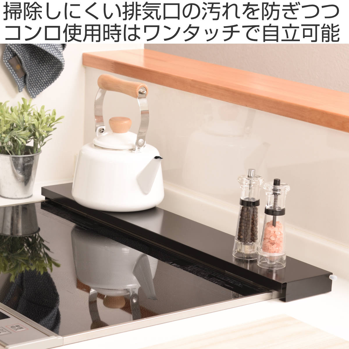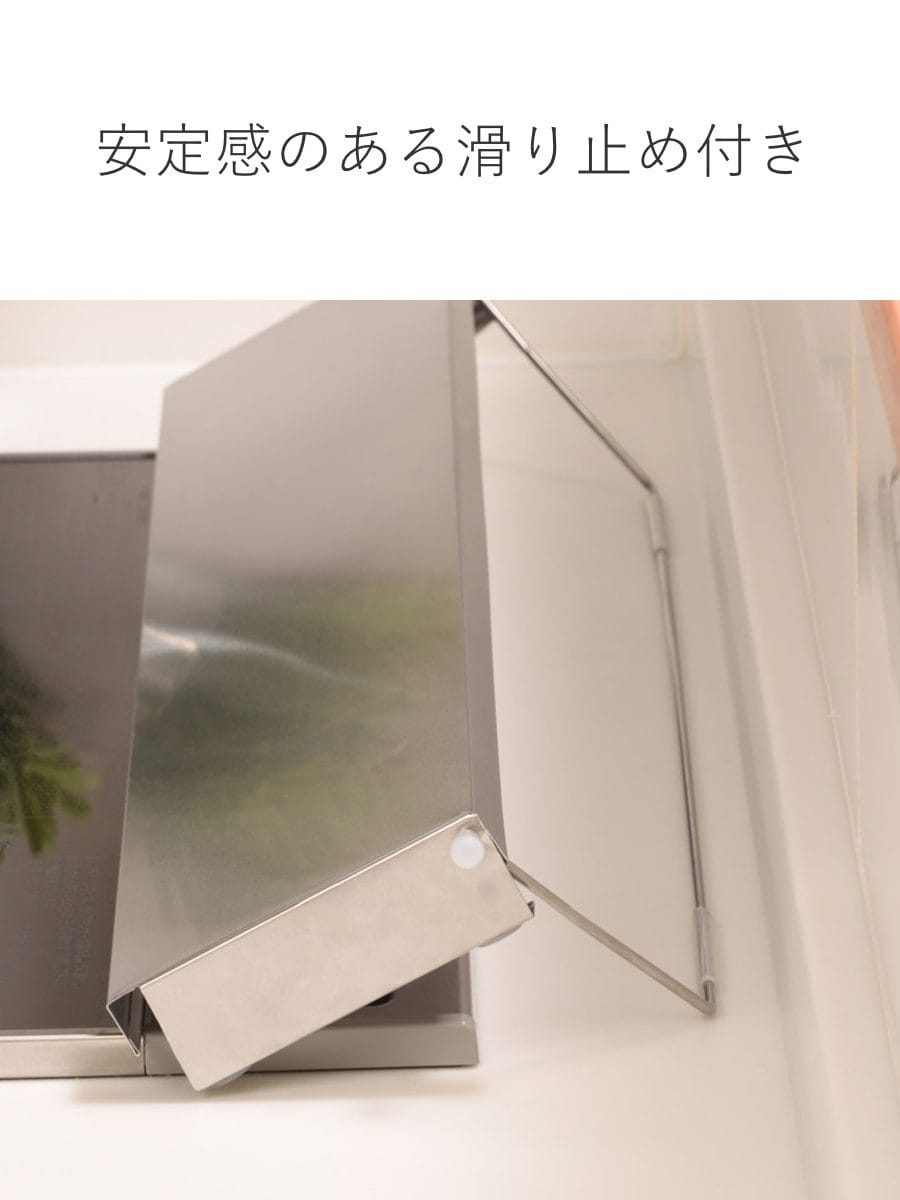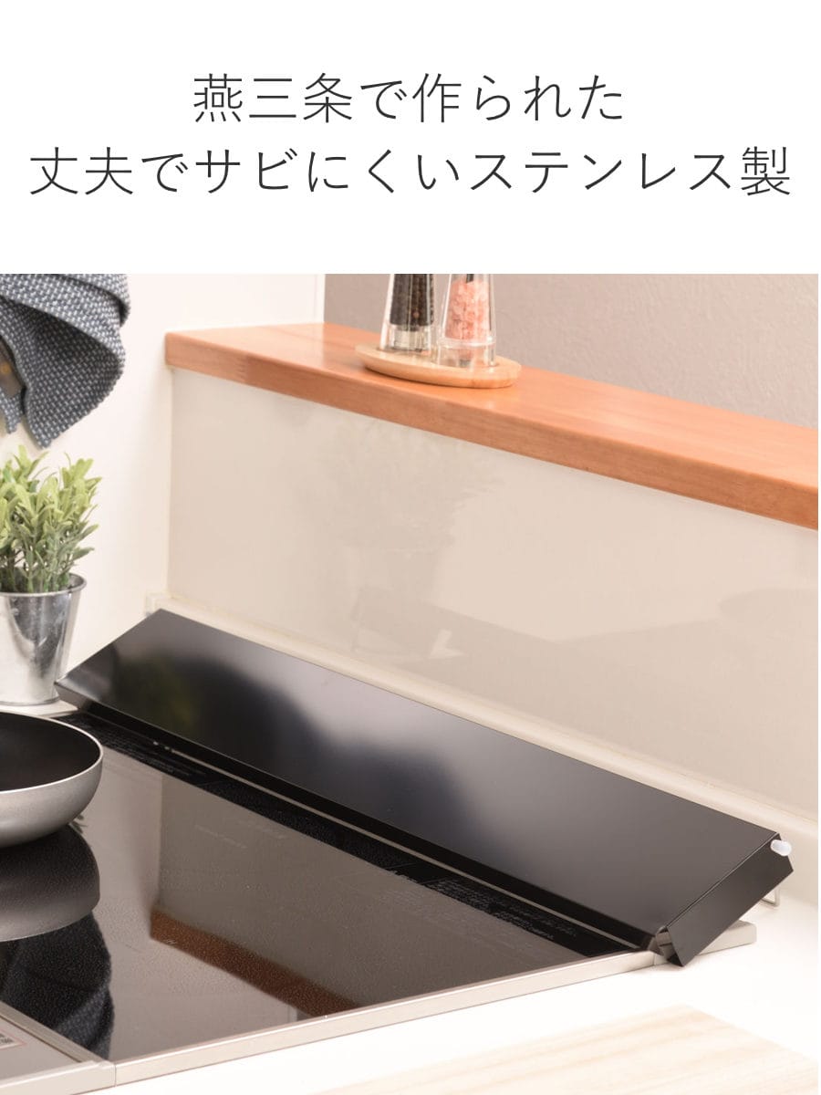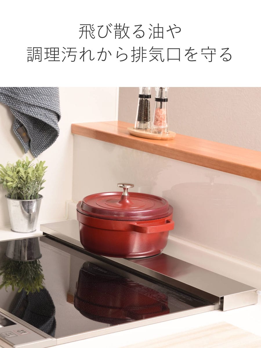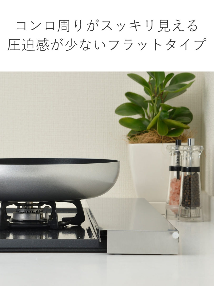 排気口の汚れを防ぎつつ、コンロ使用時はワンタッチで自立する排気口カバーです。燕三条で作られた丈夫でサビにくいステンレス製で、圧迫感が少ないフラットタイプ。目立たずスタイリッシュに置けて、飛び散る油や調理汚れから排気口を守ります。また、単に油ハネを防止するだけでなく、排気口が隠れることで、コンロ周りをシンプルにスッキリと見せてくれます。