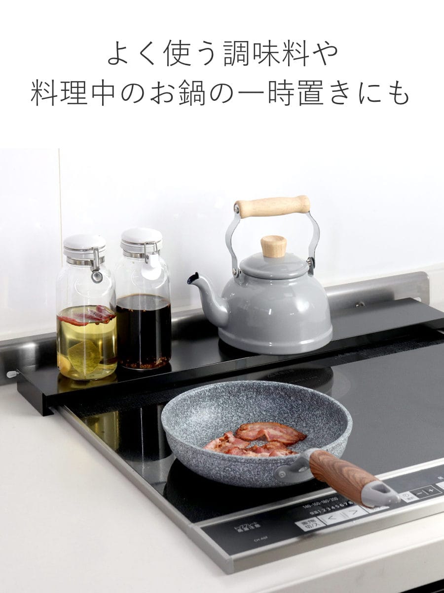 よく使う調味料や、お料理中のフライパンやお鍋の一時置きにも便利です。今まで使えてなかった排気口周りやコンロ奥のデッドスペースを有効活用することで、収納スペースが広がるだけでなく、作業効率もアップします。