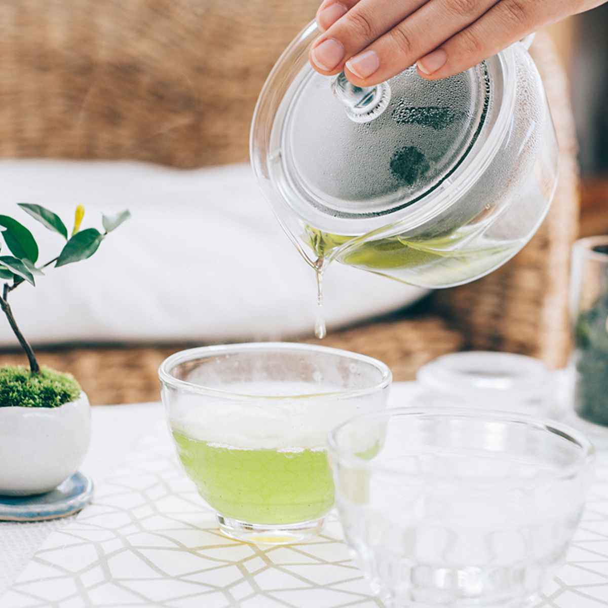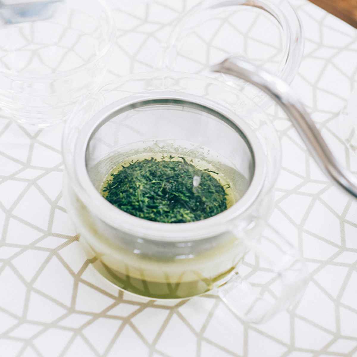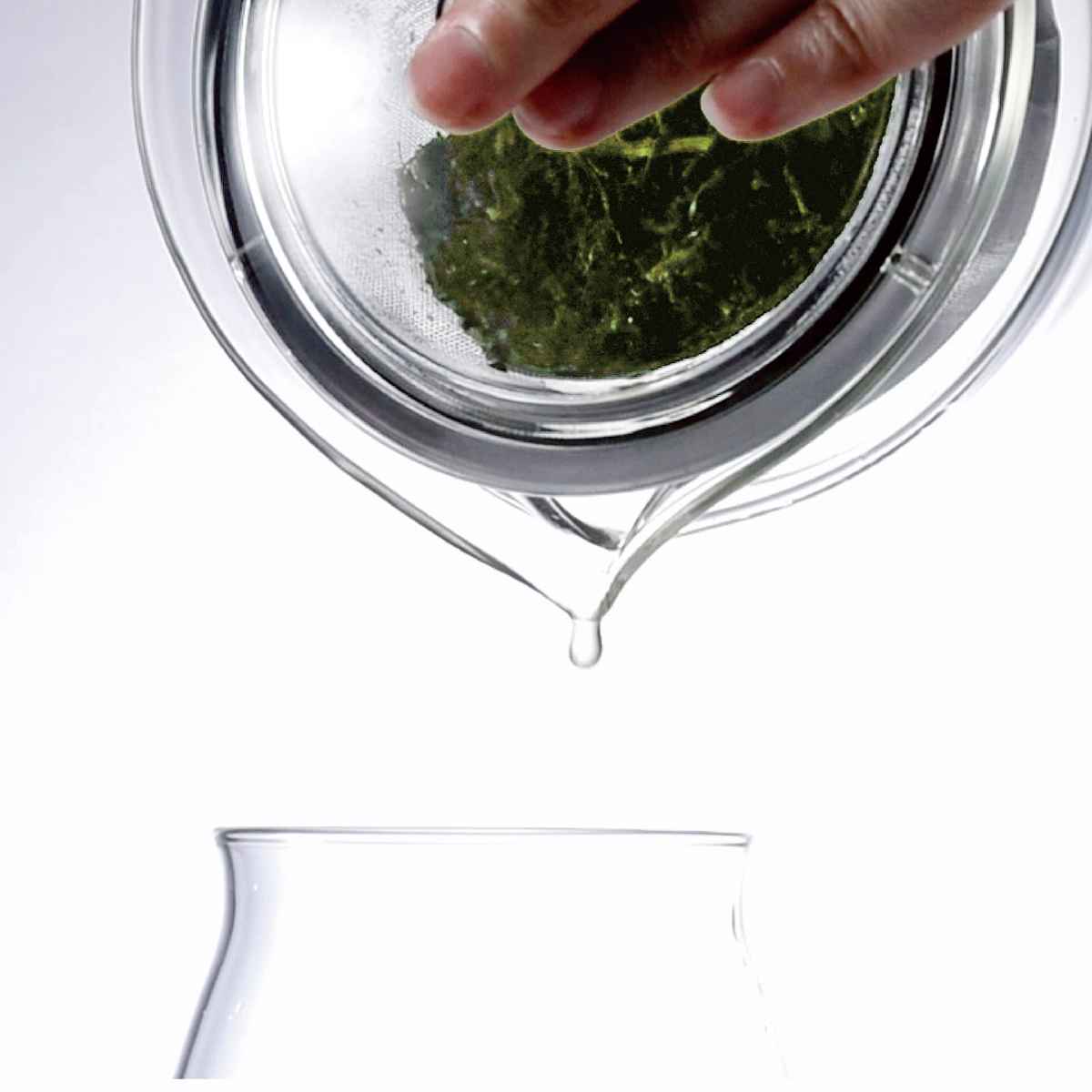 ガラスの形状に沿う大きな茶こし付きで茶葉の旨味をしっかりと抽出します。