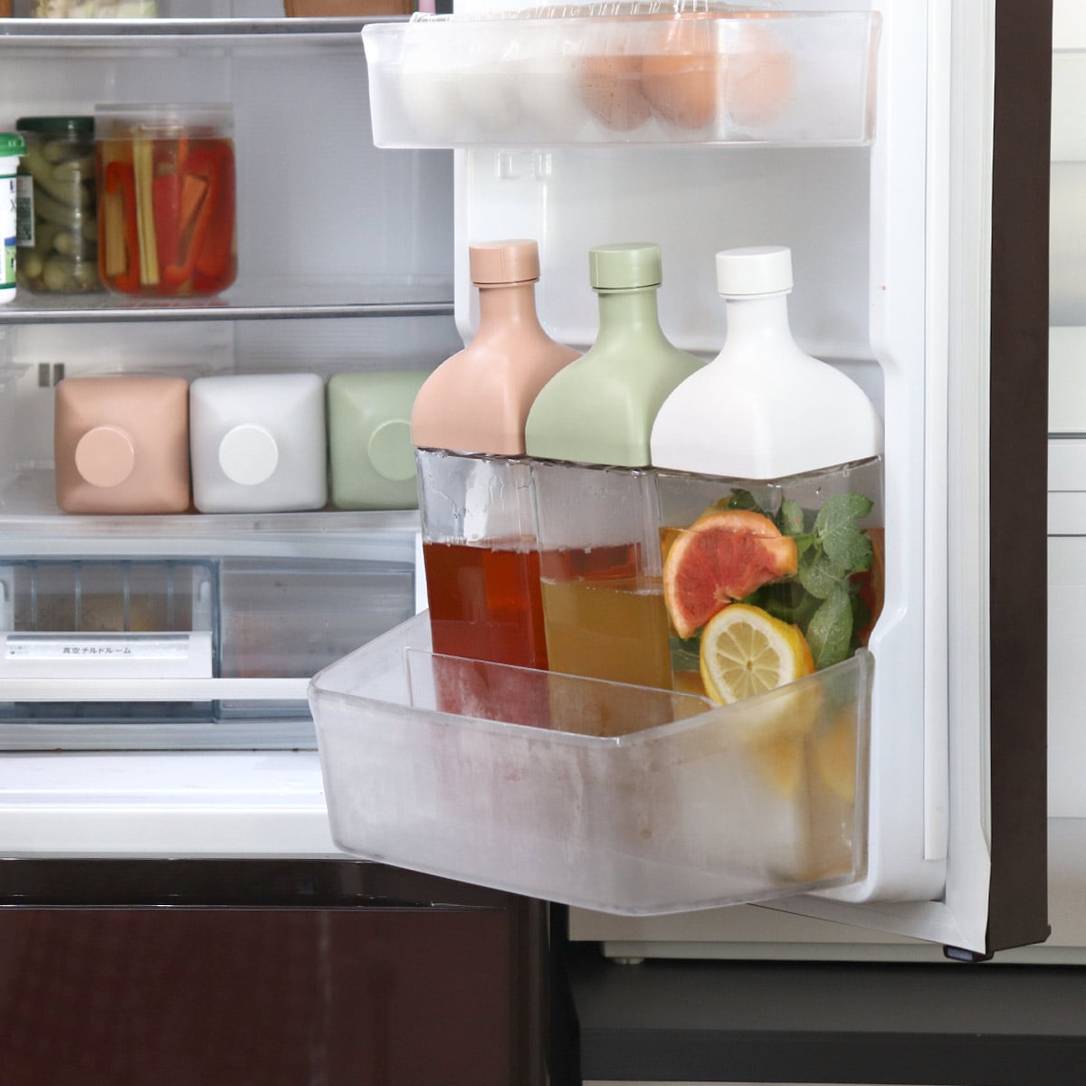 持ち手が付いていないので他の容器同士が干渉せず、冷蔵庫のポケット部分にすっきり収まります。ポケット部分がいっぱいでも横置き保存ができるので便利です。