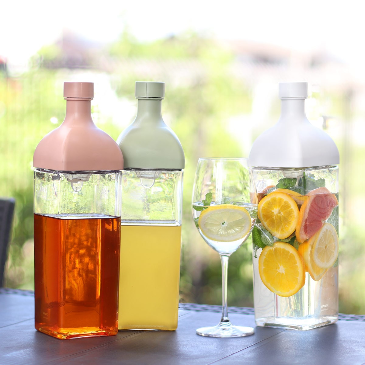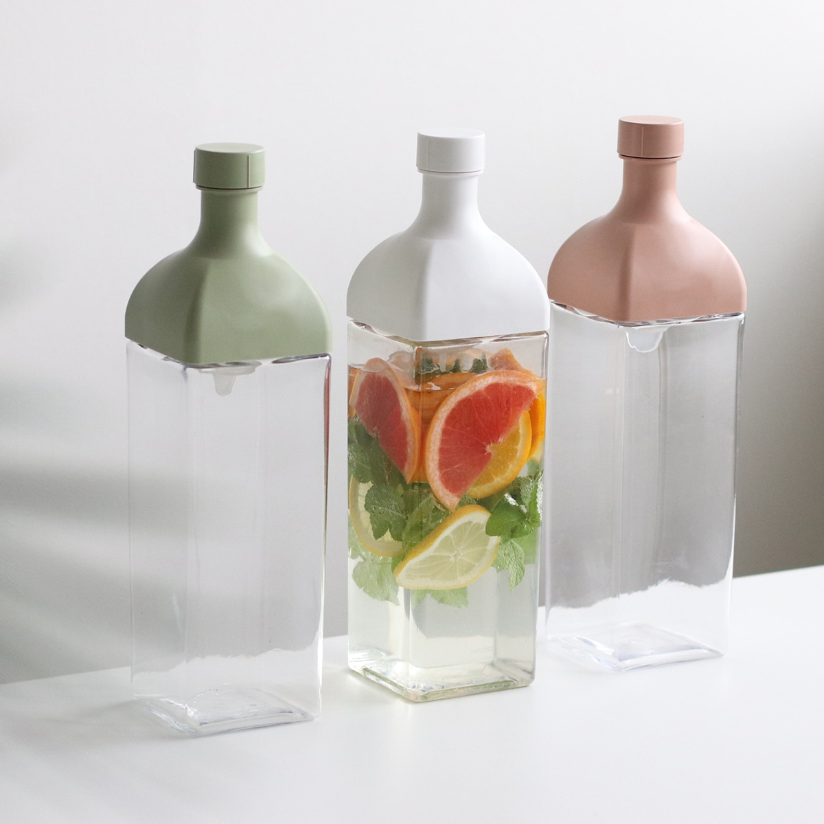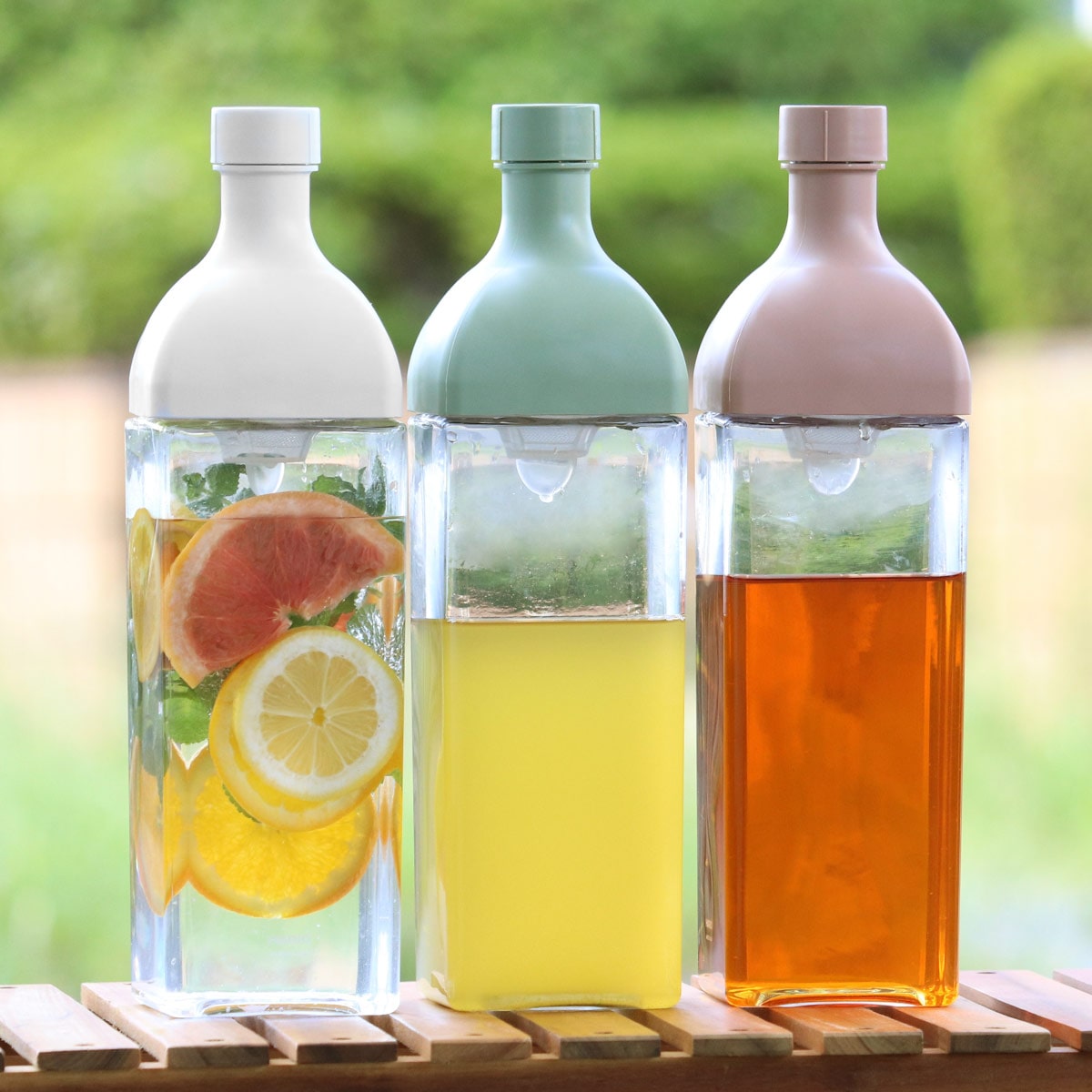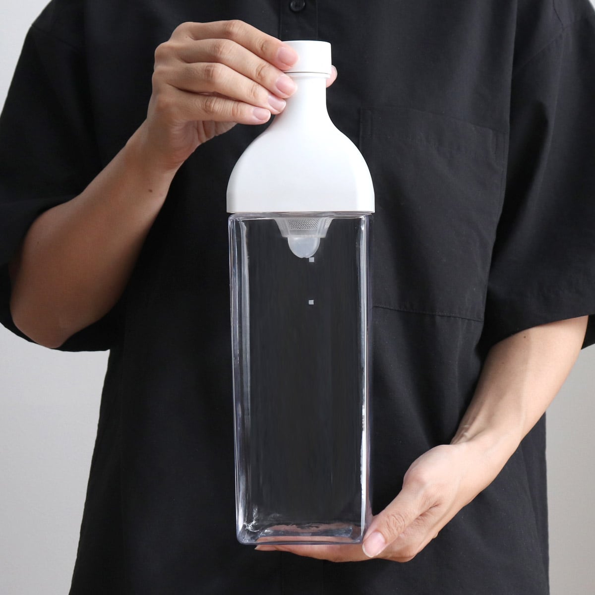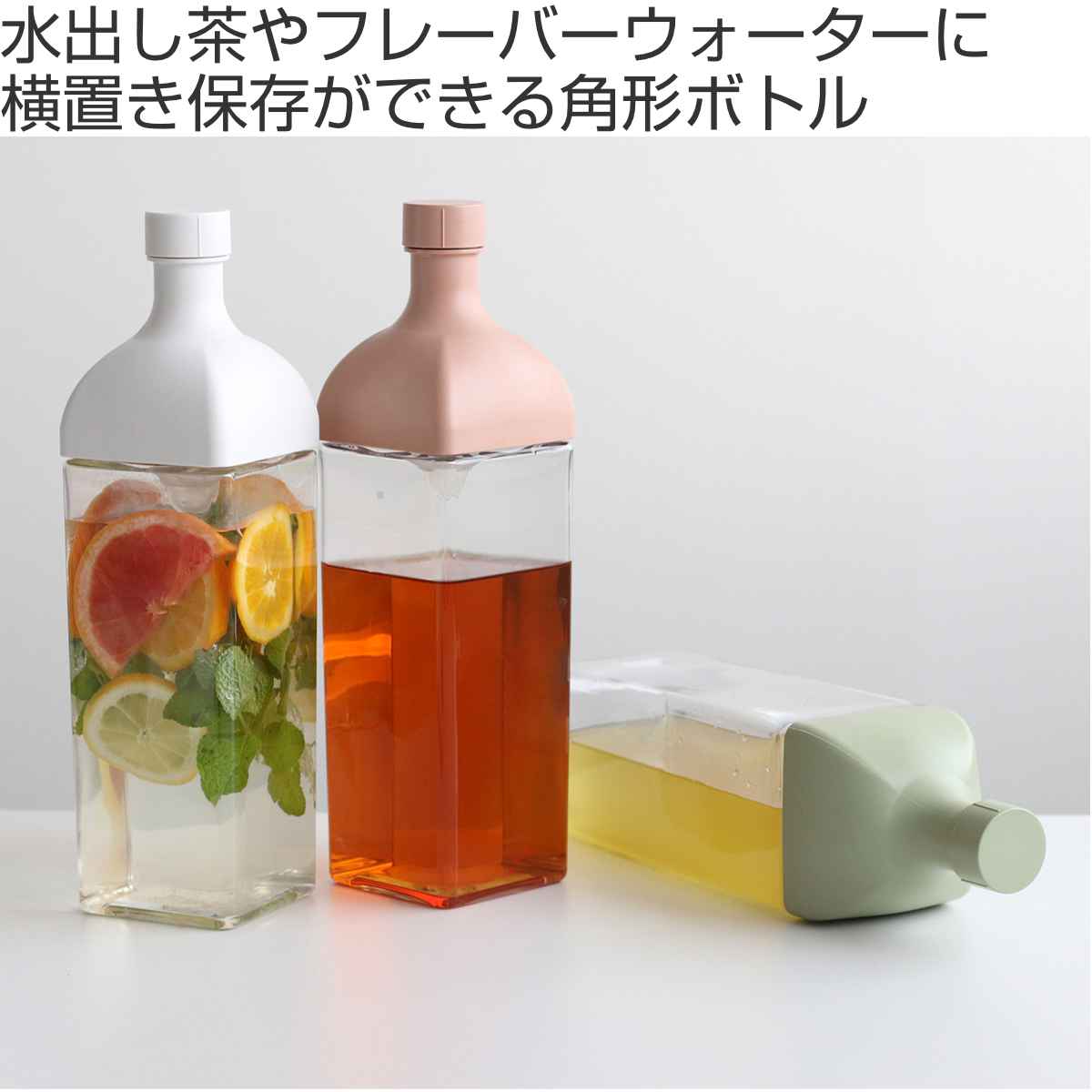 角型で丈夫なPCT樹脂「トライタン」を使用し、横置きもOKなボトルです。アウトドアはもちろん、テーブルウェアとしても、インテリアのアクセントにもぴったり。家庭用の水出し茶からゲストを呼んでのホームパーティーまで様々なシーンで活躍します。