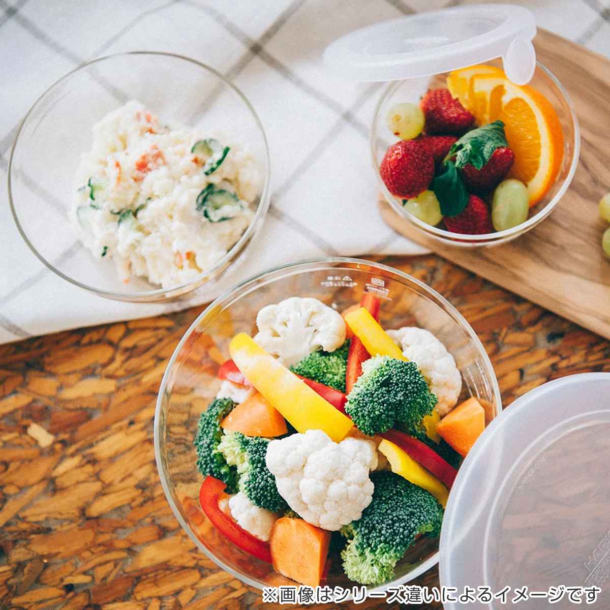 下ごしらえから、保存、温め直しまで幅広くご使用いただける耐熱ガラス製の丸型保存容器です。色と匂いが付きにくいガラス製の容器なのでいろいろな食材を気にせず保存できます。汚れも落ちやすく、洗い物が楽で気軽に使えます。