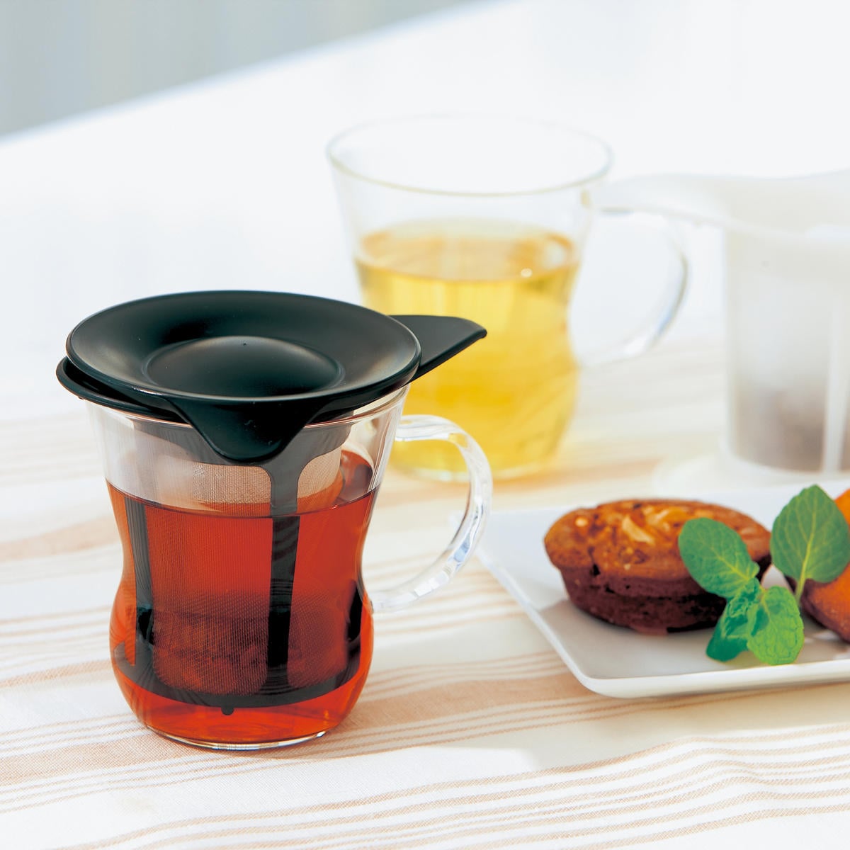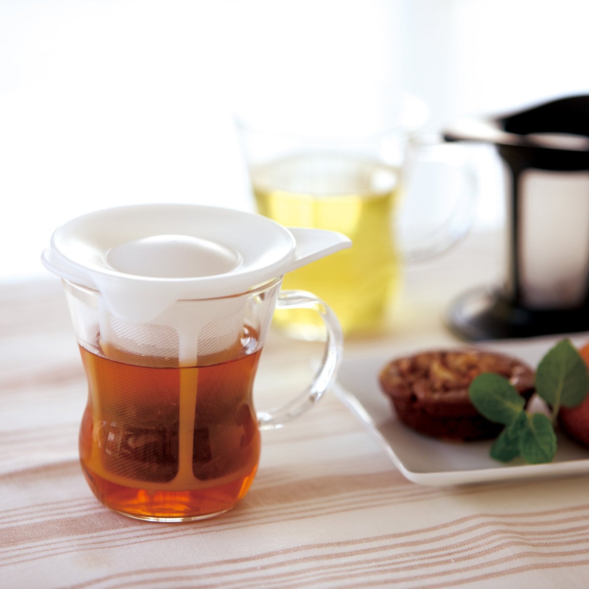 耐熱ガラスのマグカップと茶こしがセットになったワンカップティーメーカーです。急須がなくても、1人分のお茶が手軽に美味しく淹れられます。