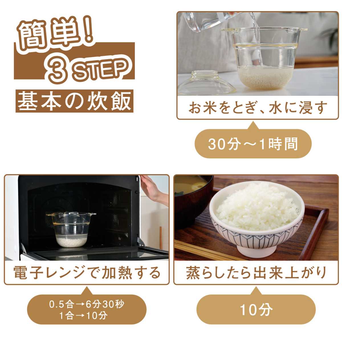 電子レンジでごはんが炊ける、電子レンジ用炊飯器です。0.5合から1合までの炊きたてのごはんが手軽に作れるので、ひとり暮らしの方やサブの炊飯器としてもおすすめです。