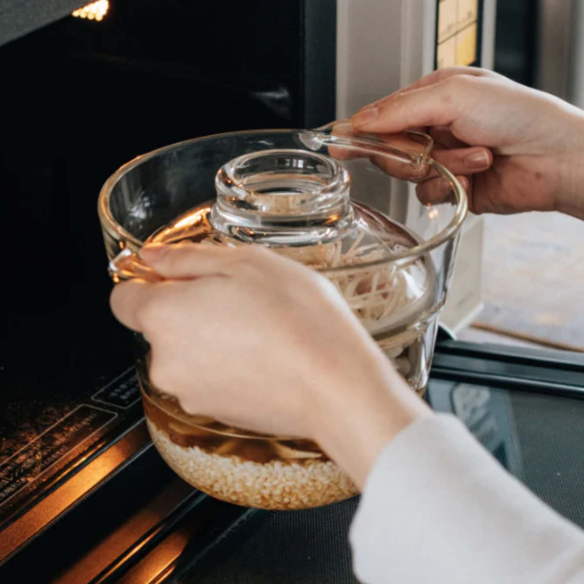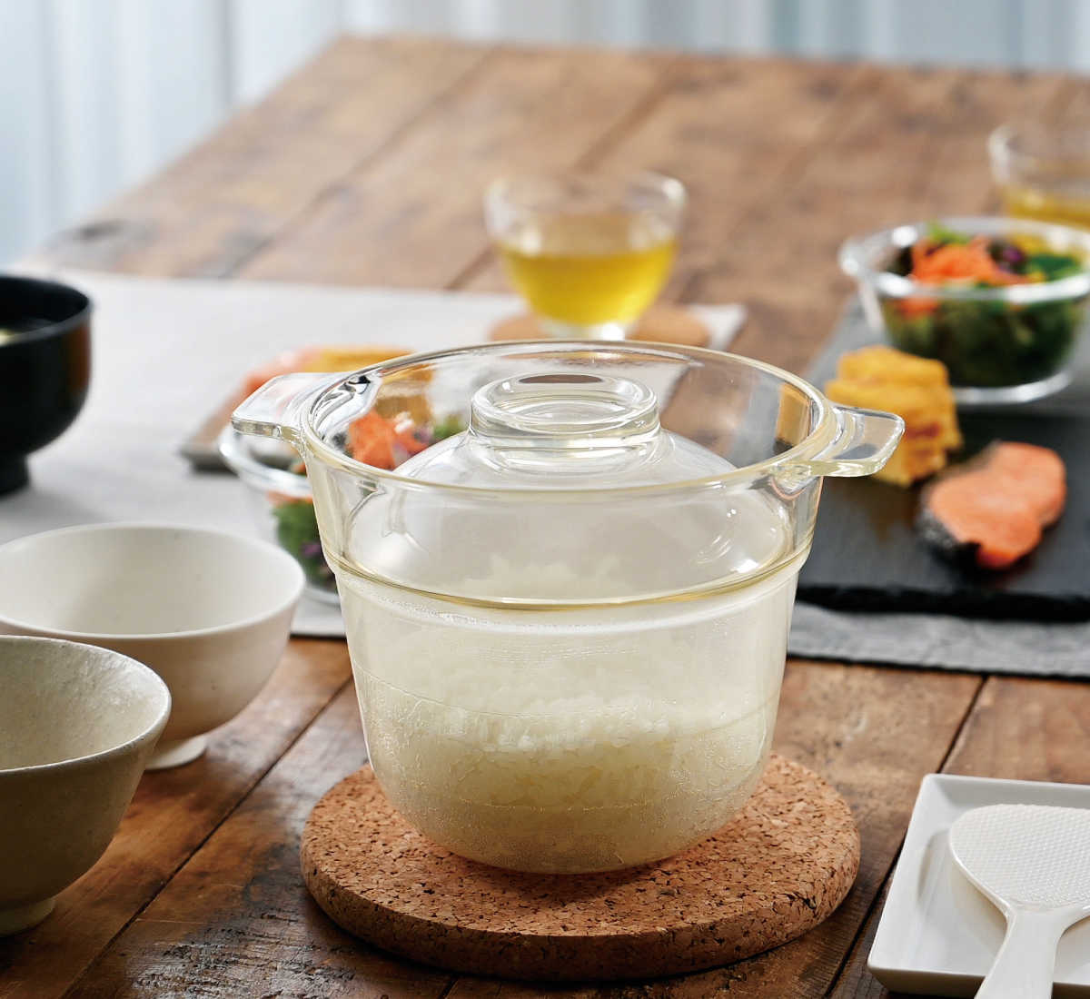 様々な食器と相性が良いガラス製なので、食卓にそのまま出してもおしゃれになじみます。調理から食事、余ったごはんの保存までをひとつの容器でできるので、洗い物も減り、家事の手間も省けます。