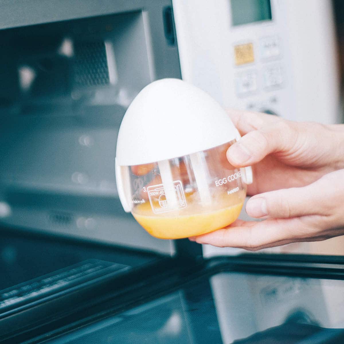 コロンとしたたまごの形がかわいいエッグクッカーです。たまごを割り入れ、フタと一体になっているピックで卵黄を崩して電子レンジで加熱すれば、簡単にたまご料理が作れます。電子レンジで調理ができるので、他の作業を同時進行でき、毎日のご飯作りを効率よくしてくれます。