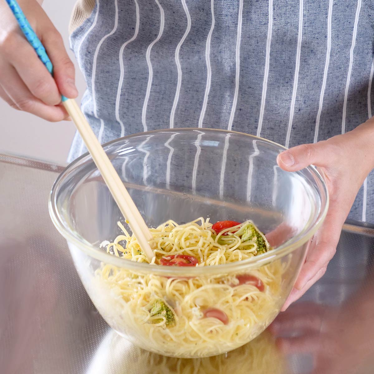 一般的な調理用ボウルに比べて深さがあるデザインは、調理や下ごしらえの時に混ぜやすさを考えた形状です。大きめサイズなのでパスタと具材を混ぜたい時などにちょうどいい大きさです。ガラスなので適度な重みがあり、混ぜる時も安定感があります。