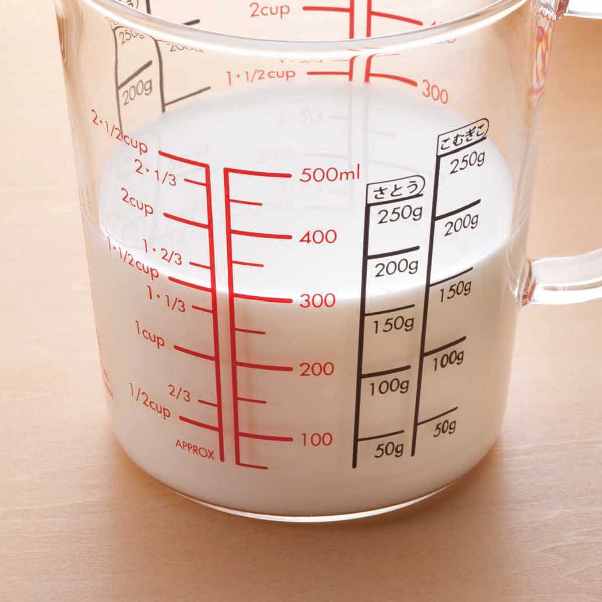 使いやすく液だれしにくいガラス製の計量カップ 500ml