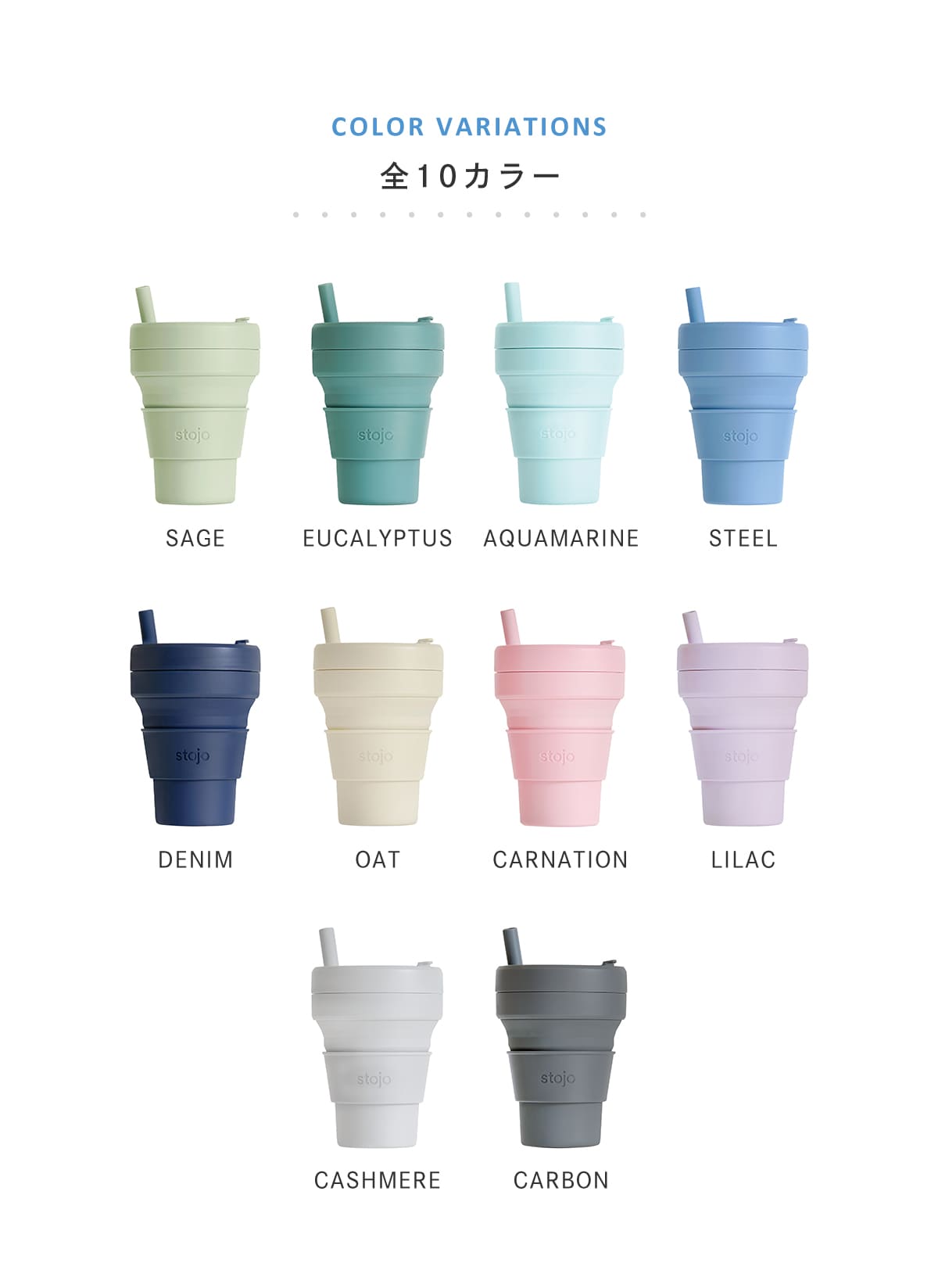 | 種類 | AQUAMARINE、DENIM、EUCALYPTUS、CARNATION、CASHMERE、LILAC、OAT、SAGE、STEEL、CARBON |