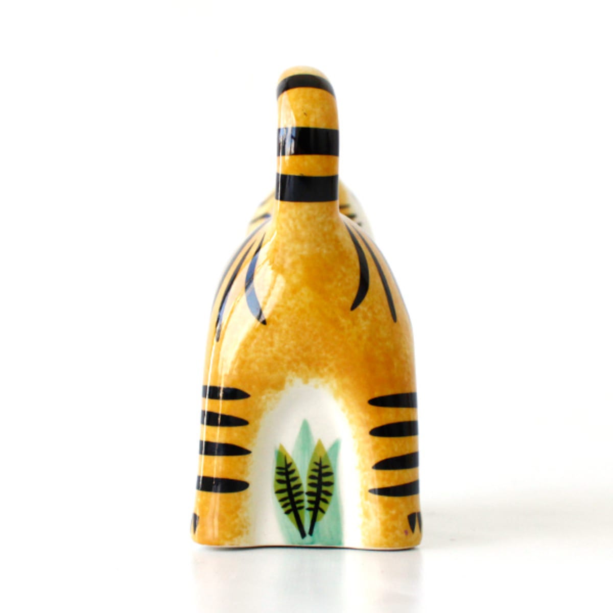 全面に鮮やかな塗装が施された、トラ型の貯金箱です。陶器製で頑丈に作られており、可愛らしい仕上がりになっています。