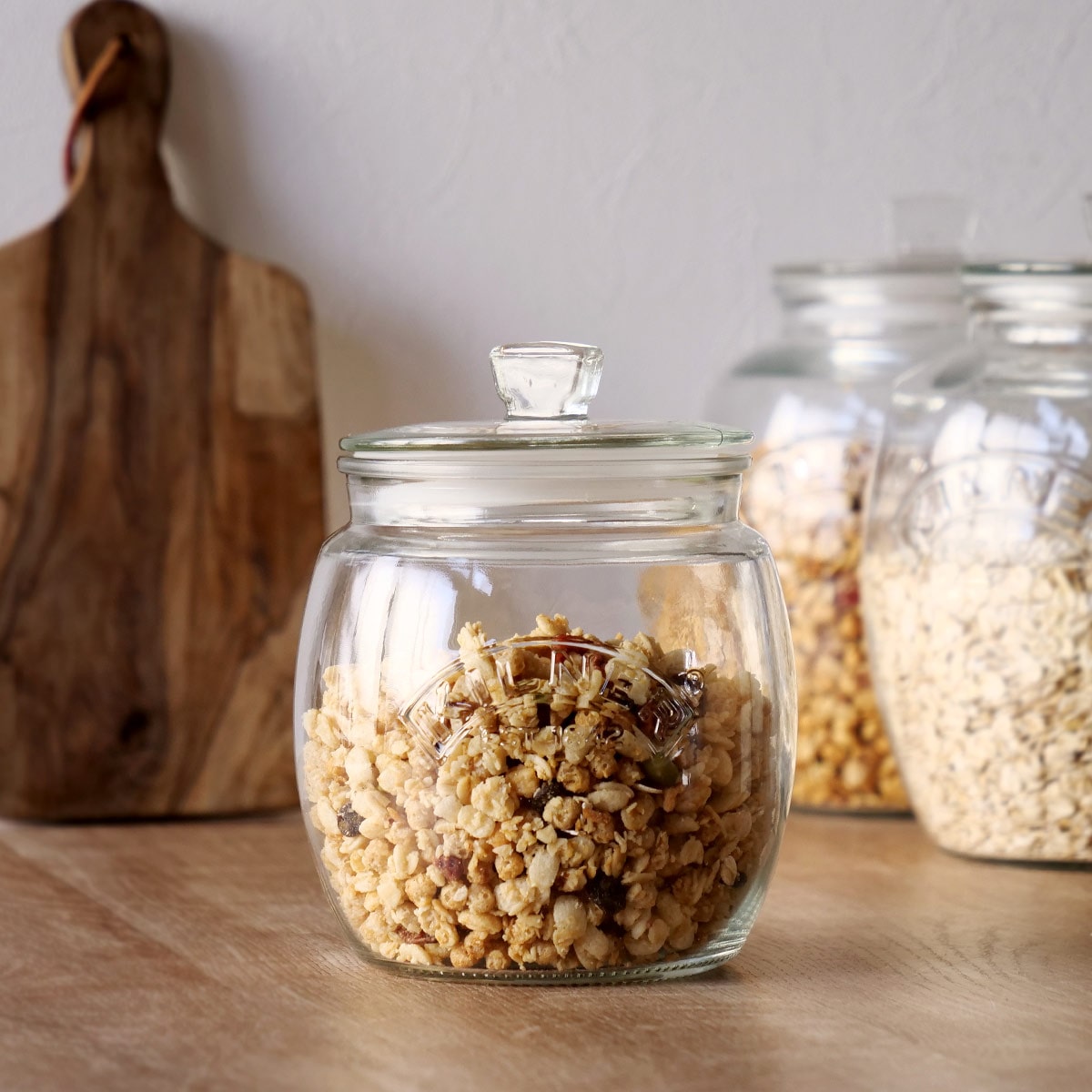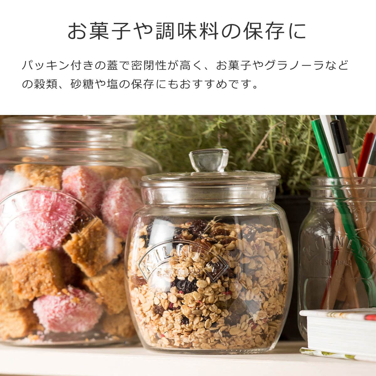 パッキン付きの蓋で密閉性が高く、気密性を保ちます。お菓子やグラノーラなどの穀類、砂糖や塩の保存にもおすすめです。