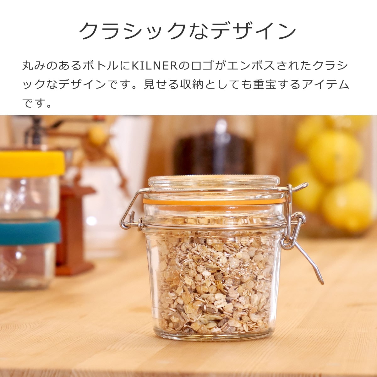 丸みのあるボトルにKILNERのロゴがエンボスされたクラシックなデザインです。彩りのある食材を入れて並べれば見栄えもよく、キッチンや食卓を飾ってくれるおしゃれアイテムに。