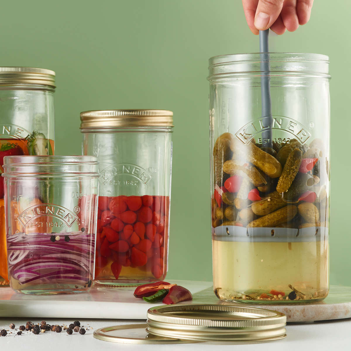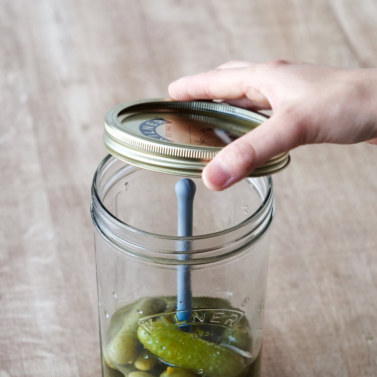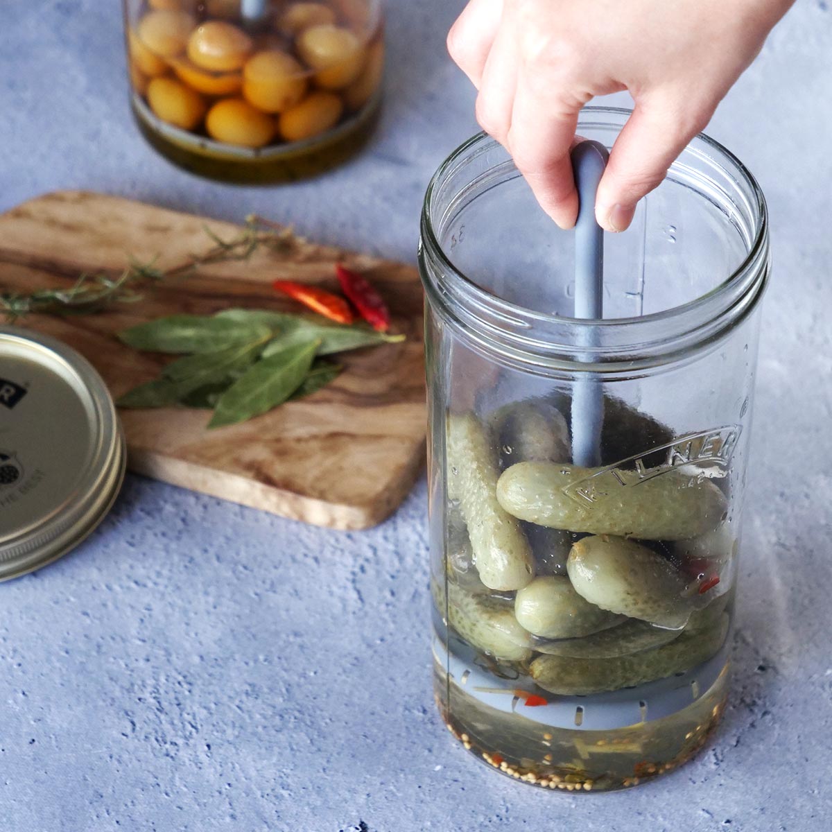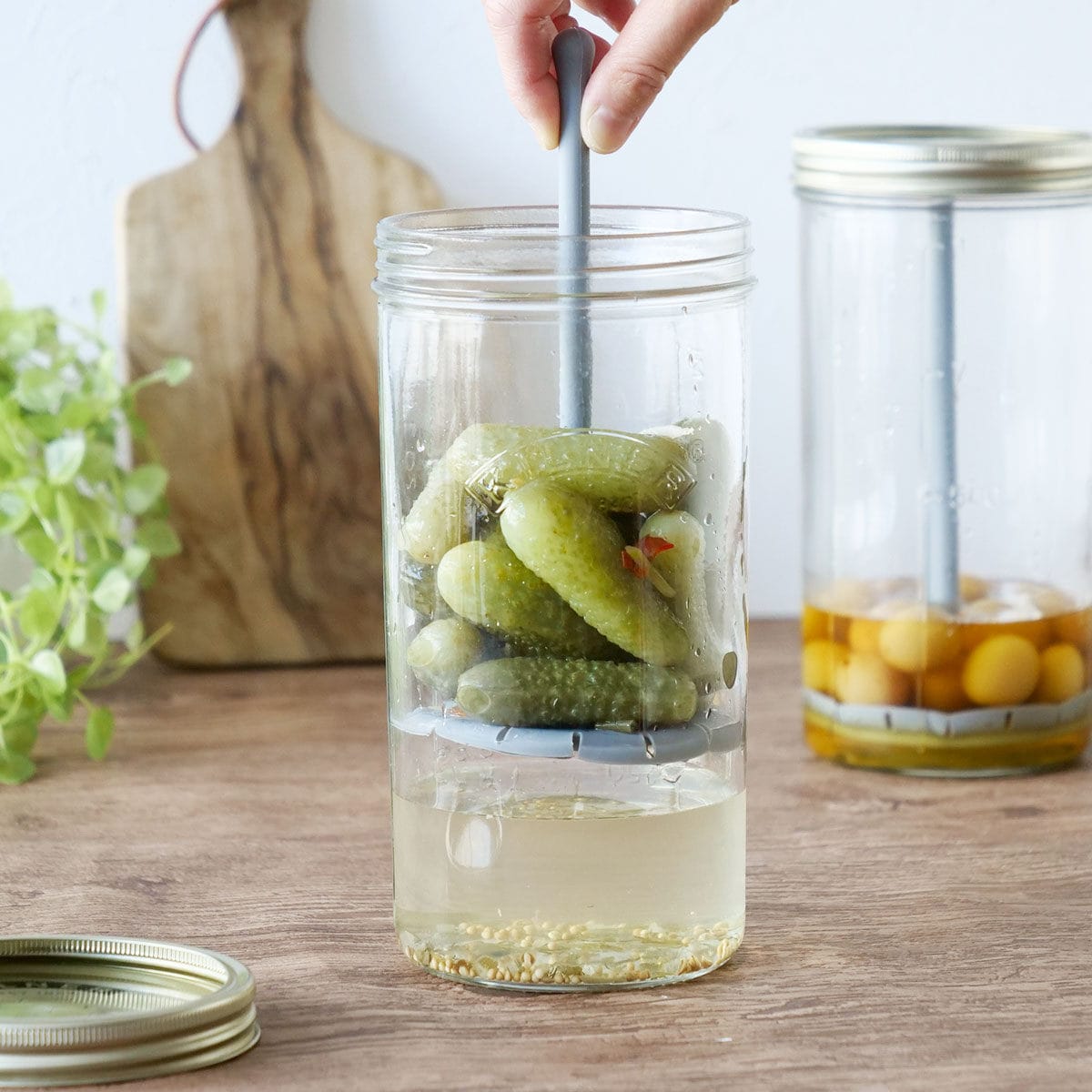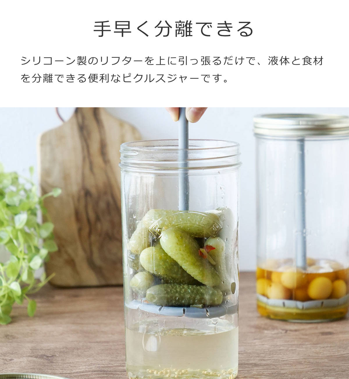 シリコーン製のリフターを上に引っ張るだけで、液体と食材を分離できるピクルスジャーです。瓶の中に残った食材をフォークで追いかける必要がなく、簡単に取り出せます。