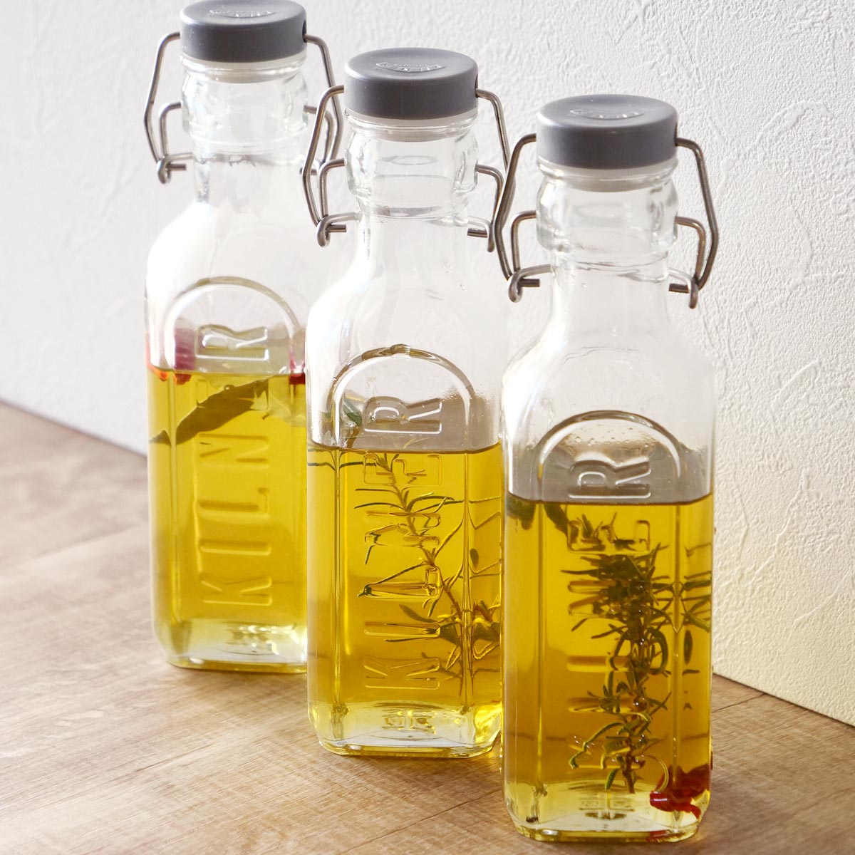 KILNERの保存ボトルは、用途に合わせて選べる使いやすいサイズ展開です。単体ではもちろん、種類別で複数使いすれば、キッチンが整って統一した空間が生まれます。