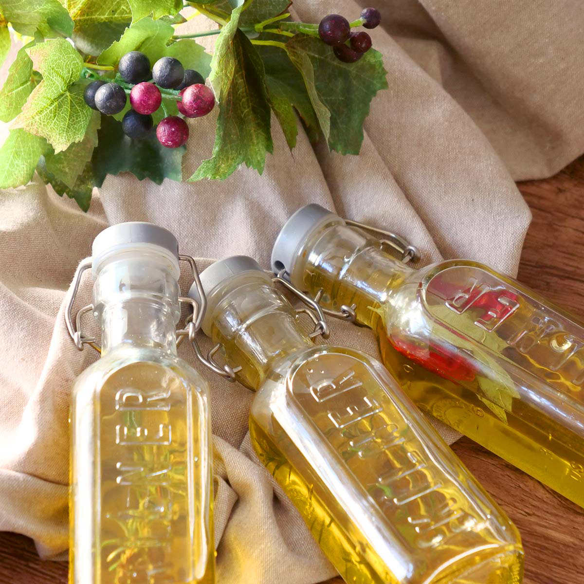ボトルはソーダガラス製で、色や匂いが移りにくく、塩分や酸に強い素材です。色汚れや匂い移りの心配もなく、油汚れも簡単に落とせるので、長く衛生的に使用できます。オイルやビネガー、シロップなど、酸化を防ぎたい物の保存に最適です。