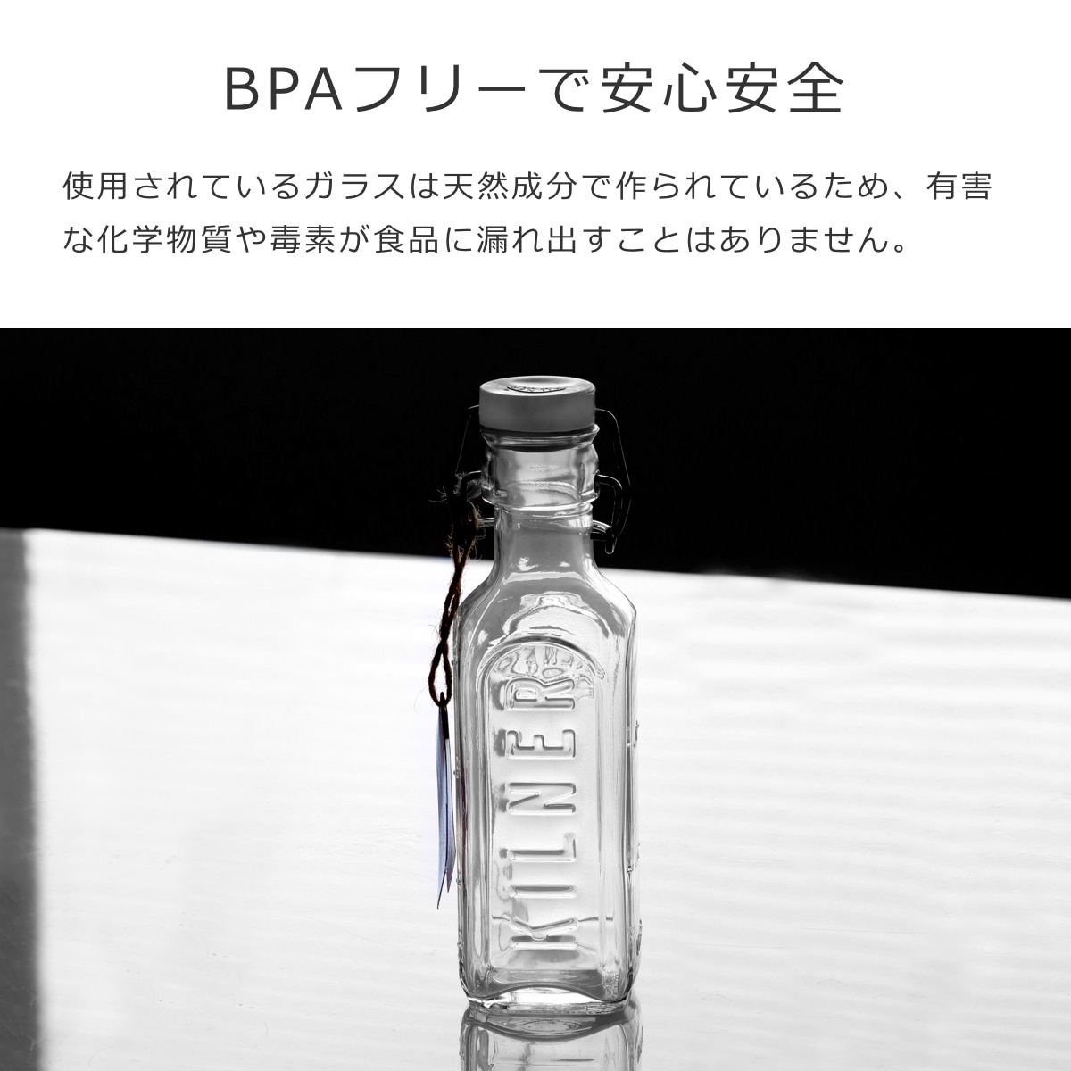 どこかレトロな形状のボトルには、KILNERのロゴが立体的に刻印されています。伝統的かつモダンスタイルの美しいデザインをお楽しみいただけます。透明な見た目から、中に入れたものが一目でわかるので保存容器として使いやすく、見せる収納としても重宝するアイテムです。