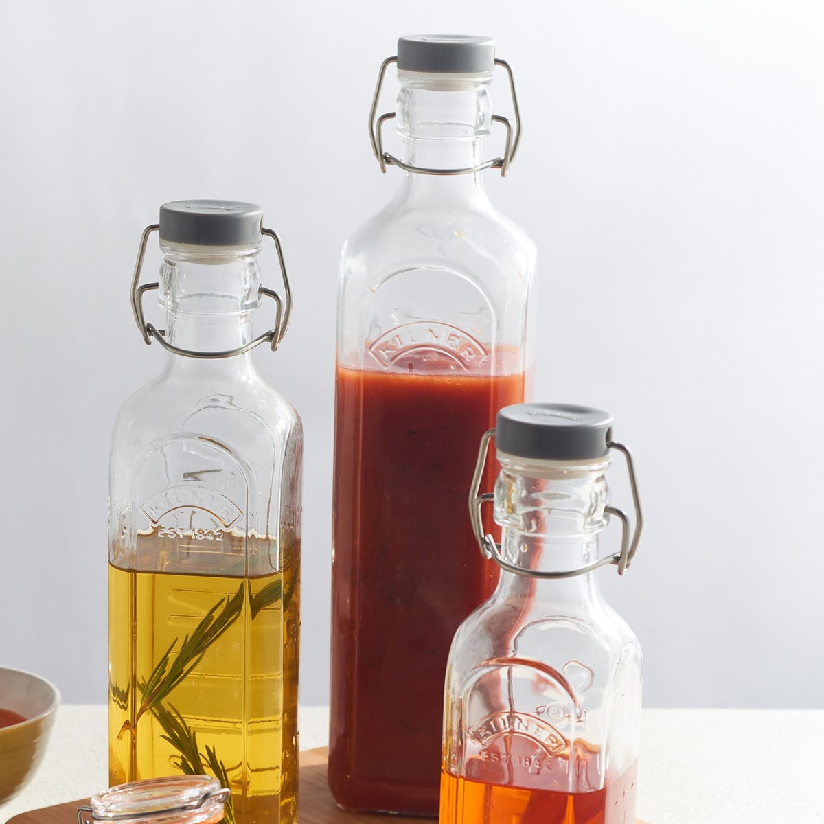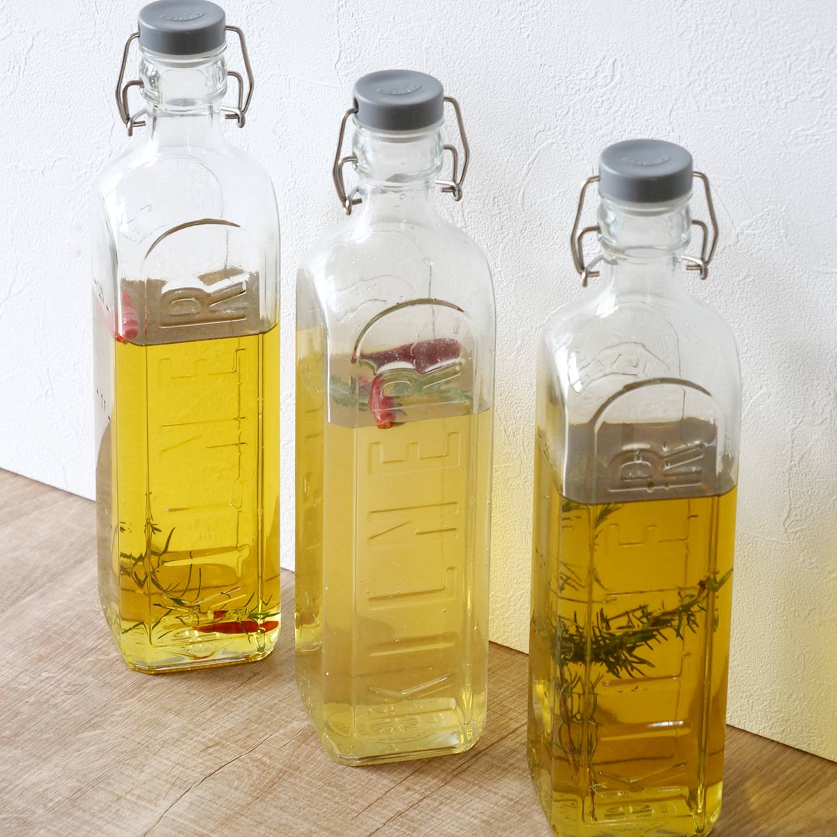 KILNERの保存ボトルは、用途に合わせて選べる使いやすいサイズ展開です。単体ではもちろん、種類別で複数使いすれば、キッチンが整って統一した空間が生まれます。