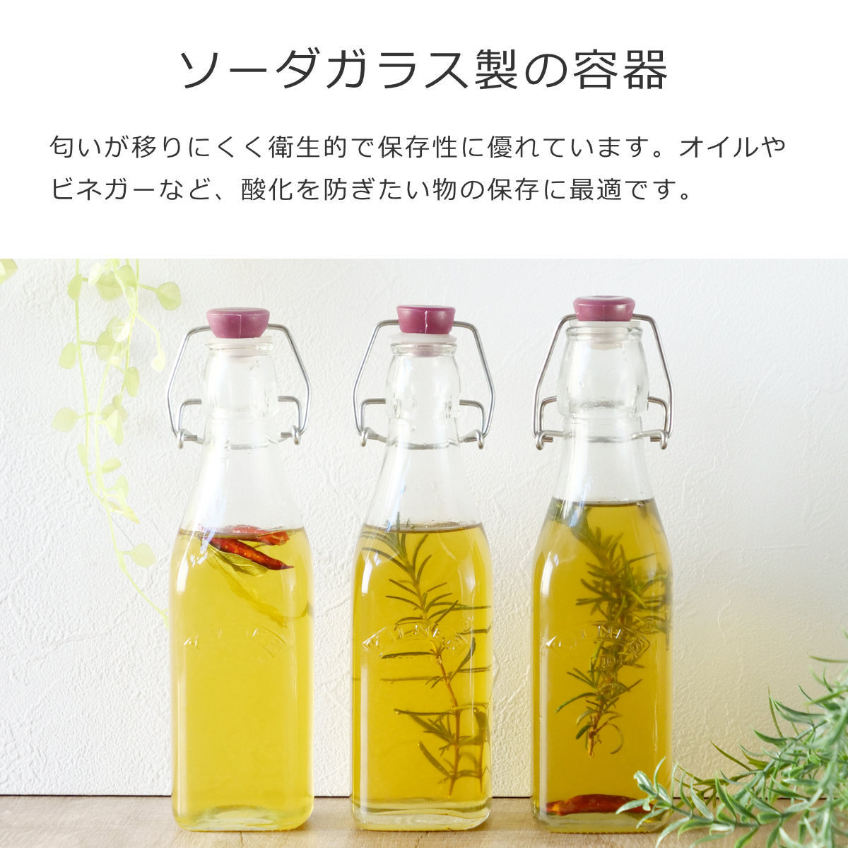 ボトルはソーダガラス製で、色や匂いが移りにくく、塩分や酸に強い素材です。色汚れや匂い移りの心配もなく、油汚れも簡単に落とせるので、長く衛生的に使用できます。オイルやビネガー、シロップなど、酸化を防ぎたい物の保存に最適です。