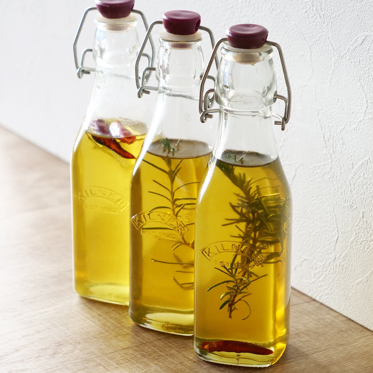 KILNERの保存ボトルは、用途に合わせて選べる使いやすいサイズ展開です。単体ではもちろん、種類別で複数使いすれば、キッチンが整って統一した空間が生まれます。
