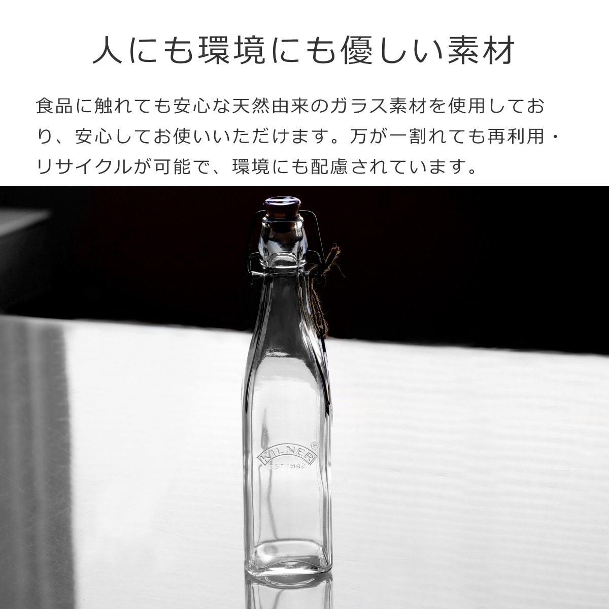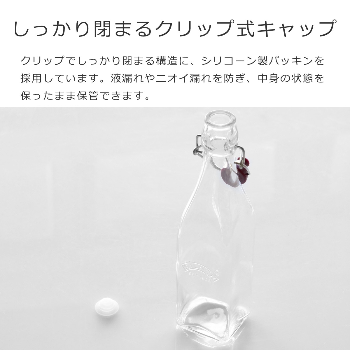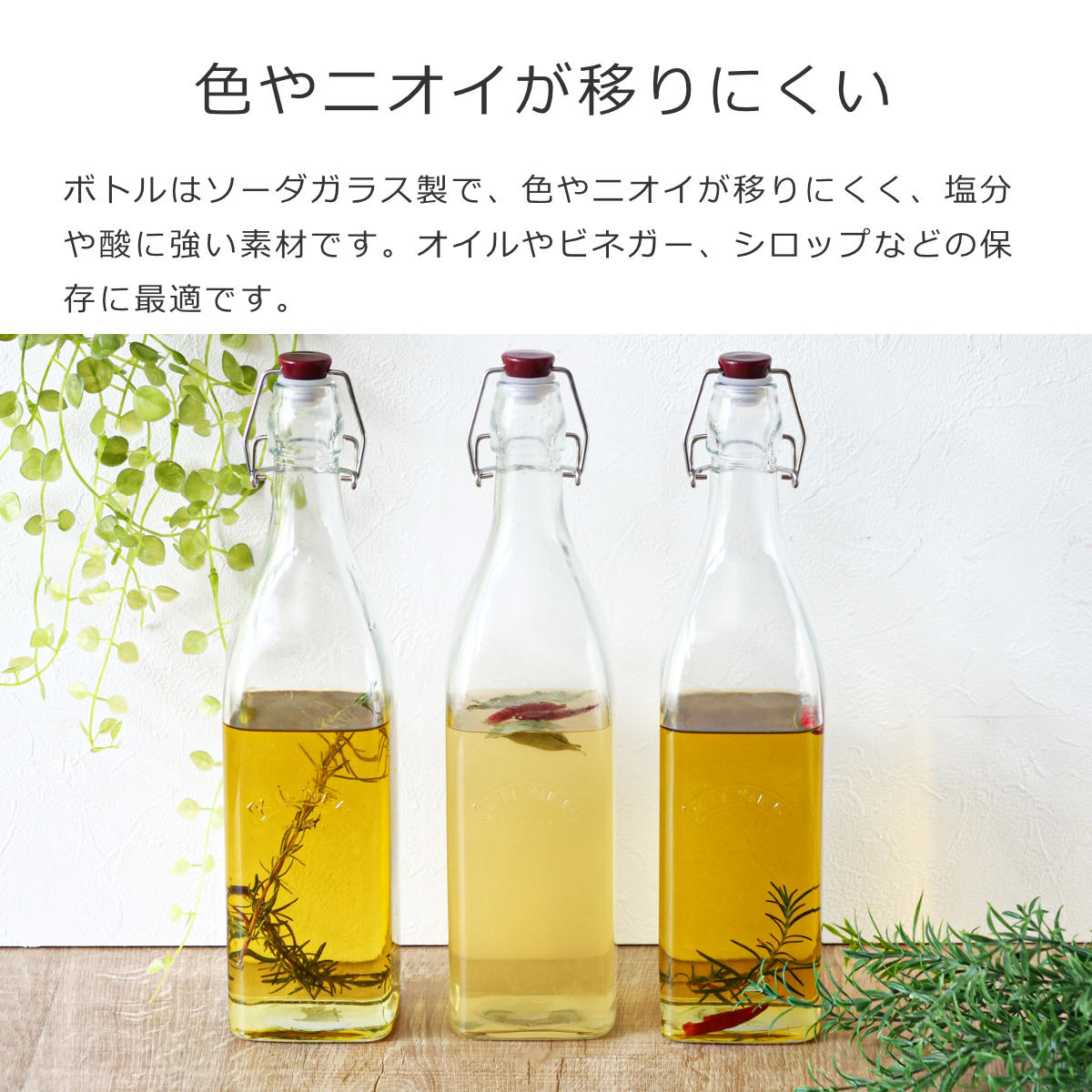 ボトルはソーダガラス製で、色やニオイが移りにくく、塩分や酸に強い素材です。プラスチック製と違って、長期保存しても色汚れやニオイ移りの心配がないため、オイルやビネガー、シロップなどの保存に最適です。油汚れも簡単に落とせるので、長く衛生的に使用できます。