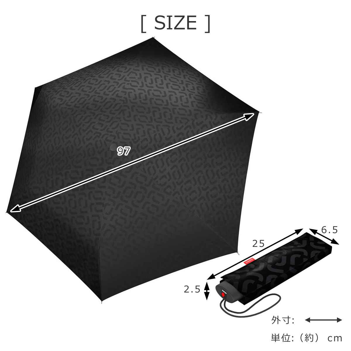 | サイズ | 収納時:約 幅6.5×厚さ2.5×高さ25(cm) 使用時:約 直径97(cm) 親骨の長さ:約 55(cm)(6本骨) |