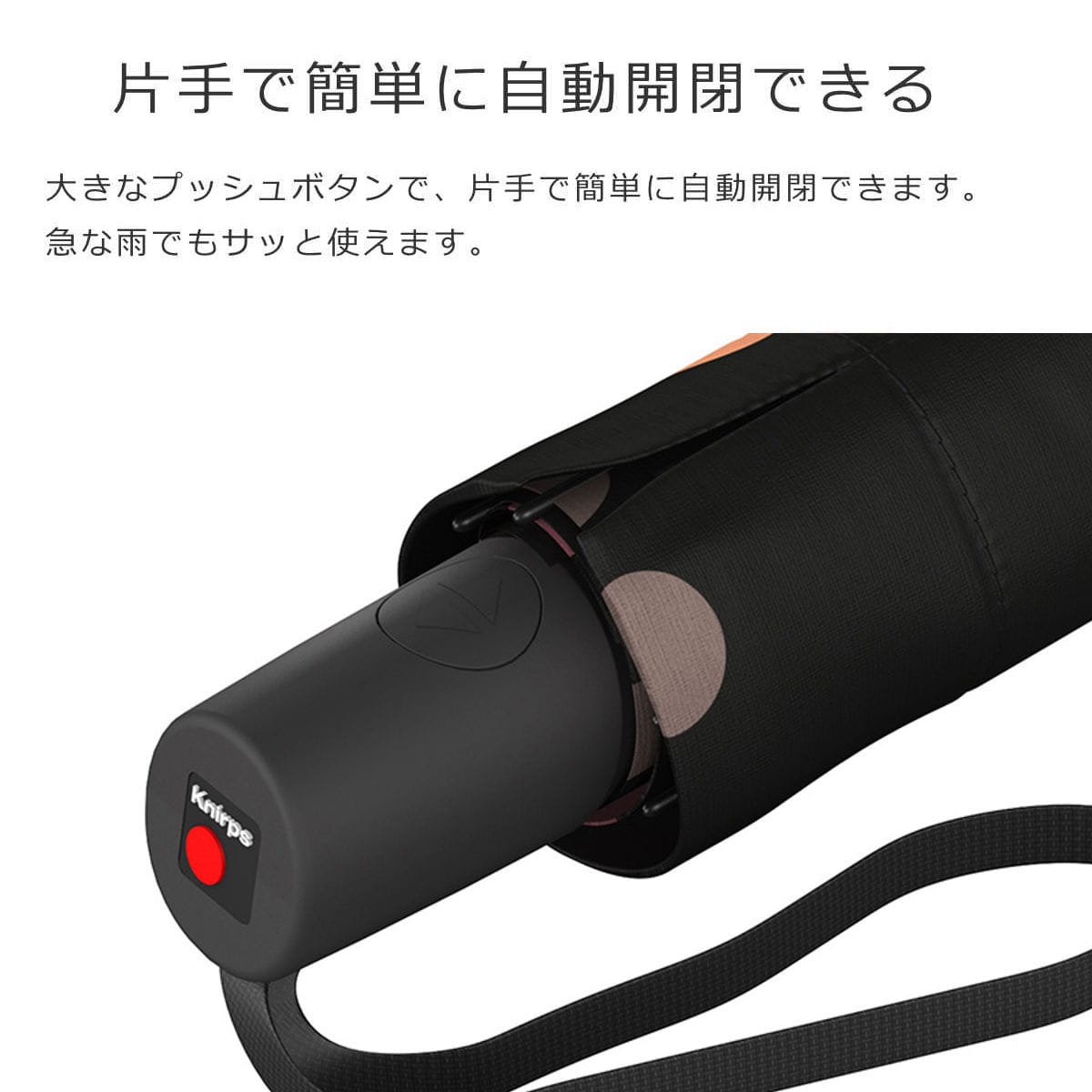 大きなプッシュボタンが付いており、片手で簡単に自動開閉できます。急な雨でもサッと使えて便利です。