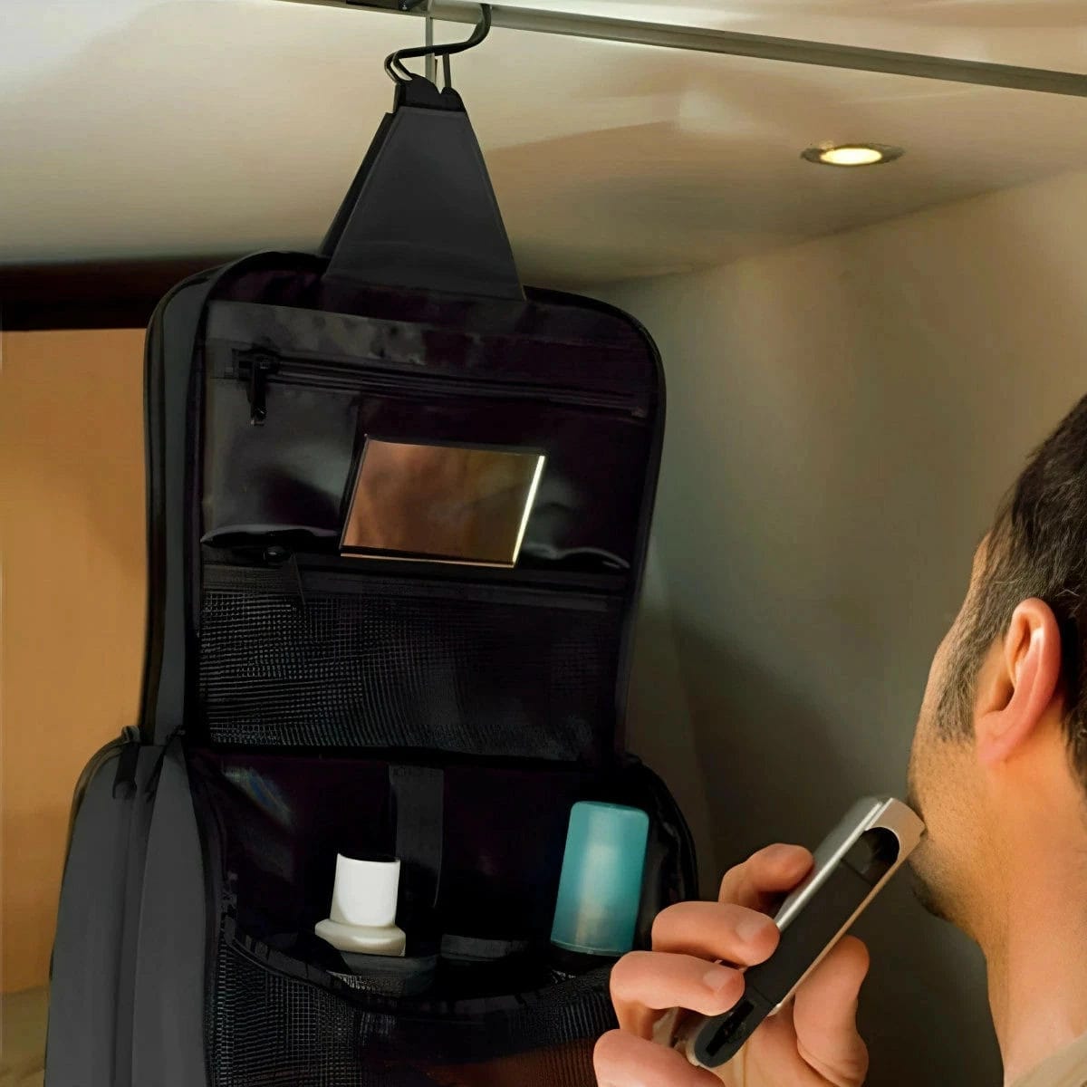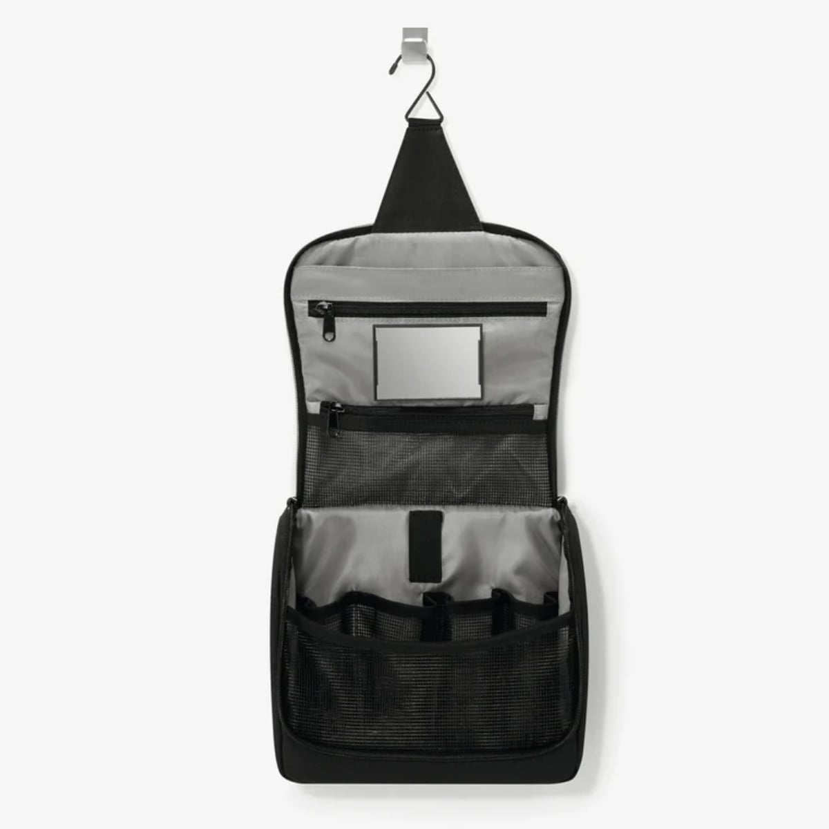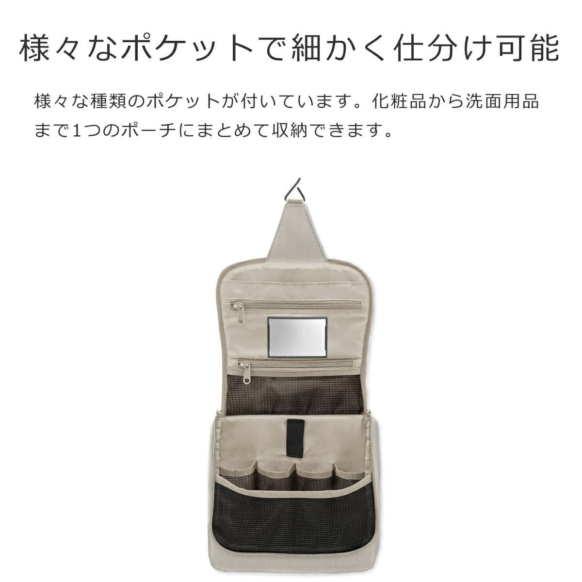 フック部分を引っ掛けて、バスルームや洗面所に吊り下げて使用できます。ポーチを広げるとドレッサーのように使えるので、身だしなみを整える際に便利です。