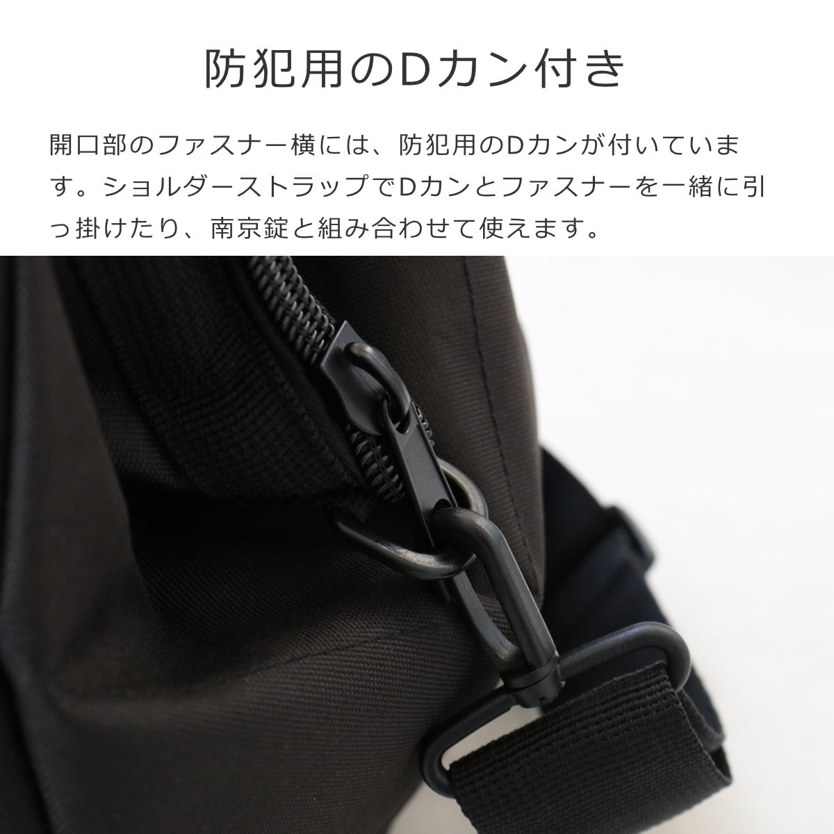 開口部のファスナー横には、防犯用のDカンが付いています。ショルダーストラップでDカンとファスナーを一緒に引っ掛けたり、南京錠と組み合わせて使えます。旅行時にも大切な荷物をしっかりと守ることができます。