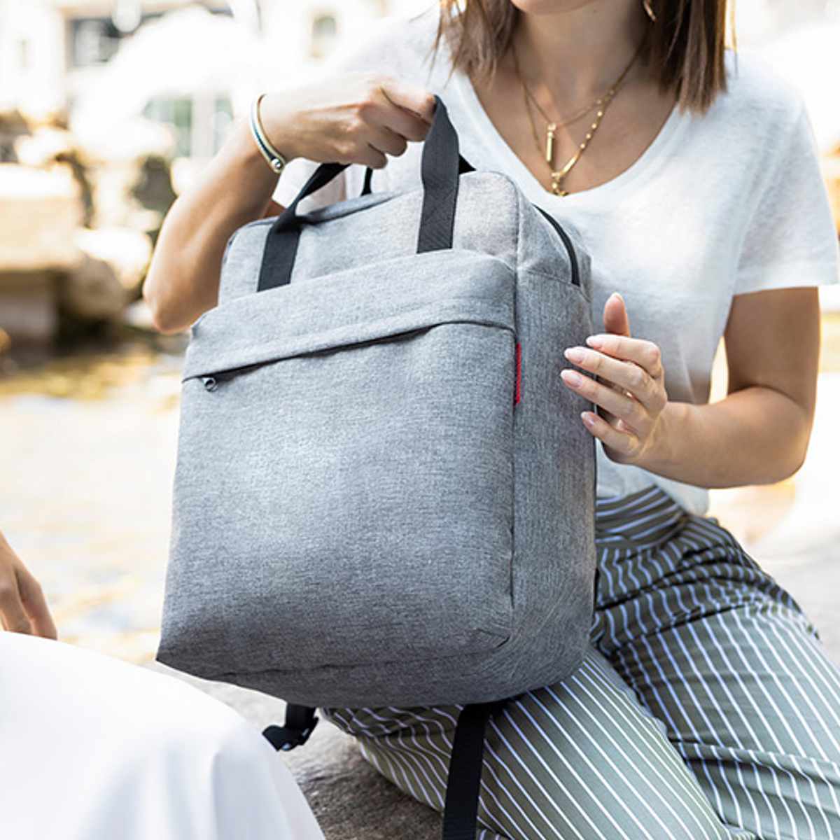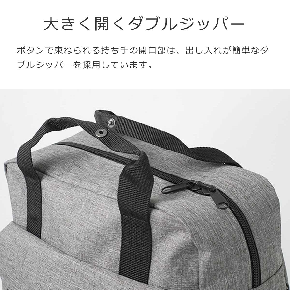 ボタンで束ねられる持ち手の開口部は、出し入れが簡単なダブルジッパーを採用しています。
