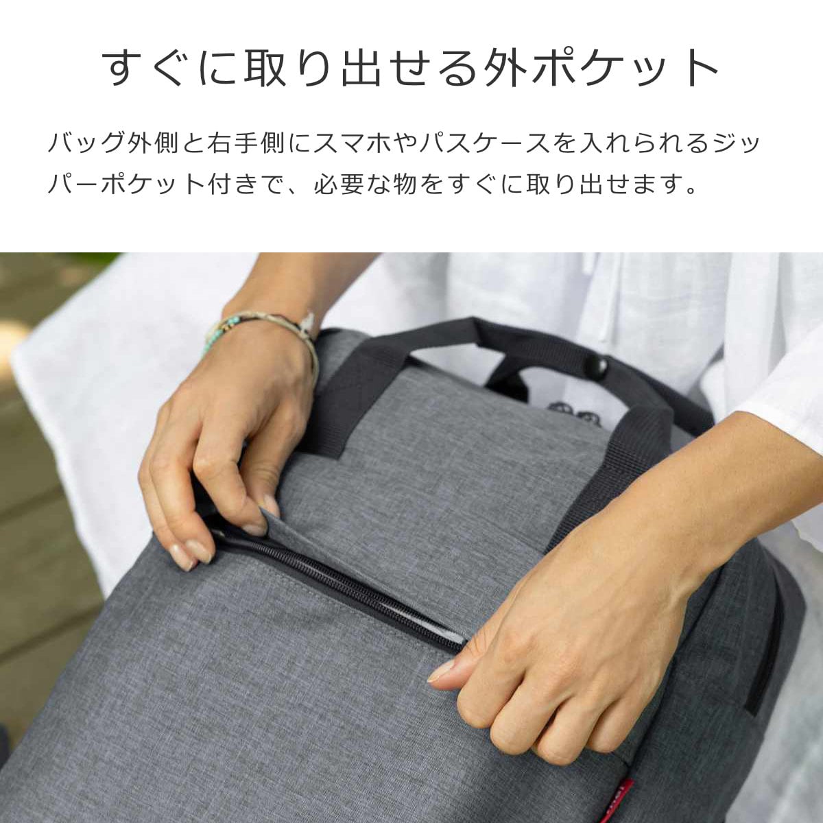 バッグ外側と右手側にスマホやパスケースを入れられるジッパーポケット付きです。