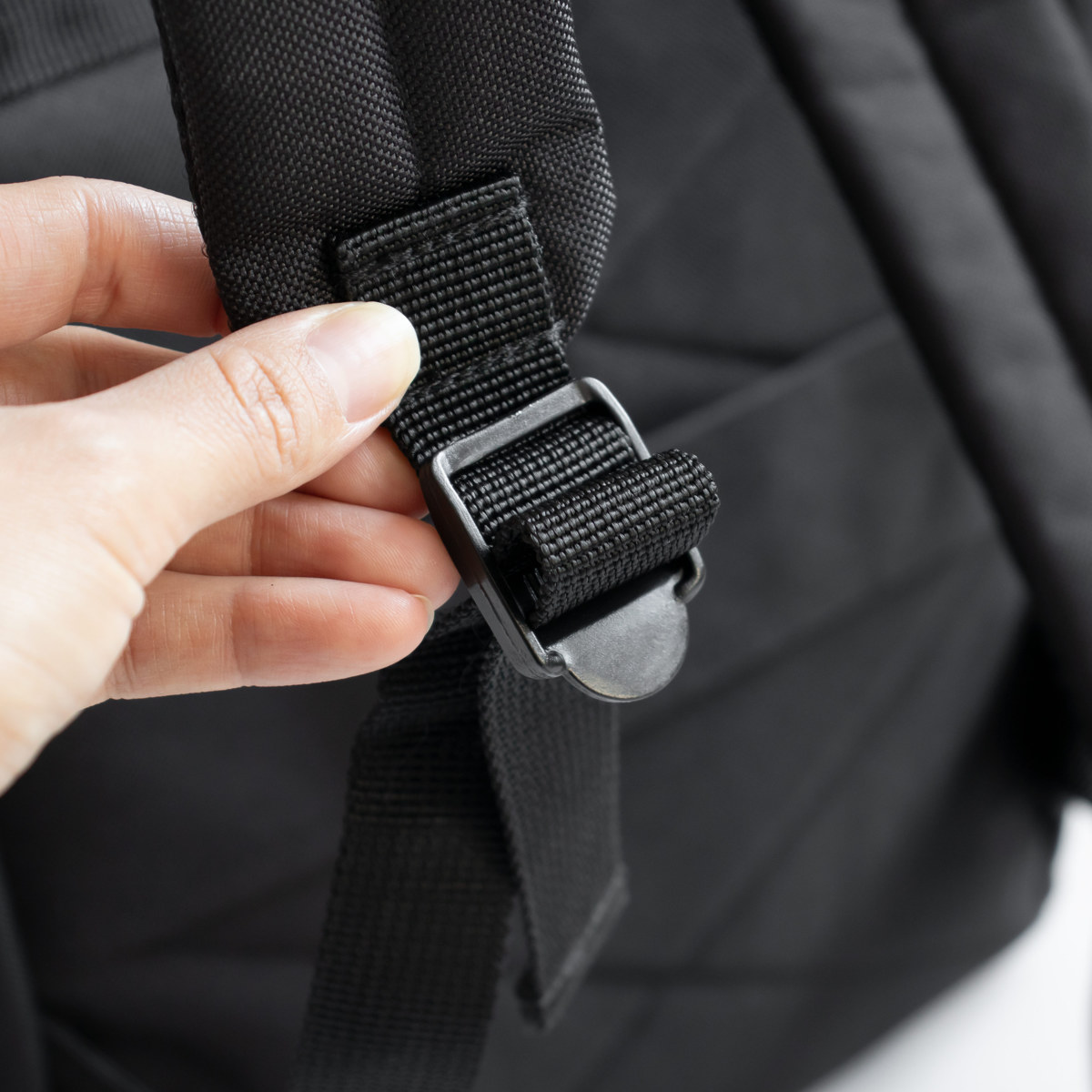 リュックには持ち手が付いており、背負うだけでなく、バッグのように持つことができます。持ち手はボタンでまとめられ、スムーズに持ち運べます。