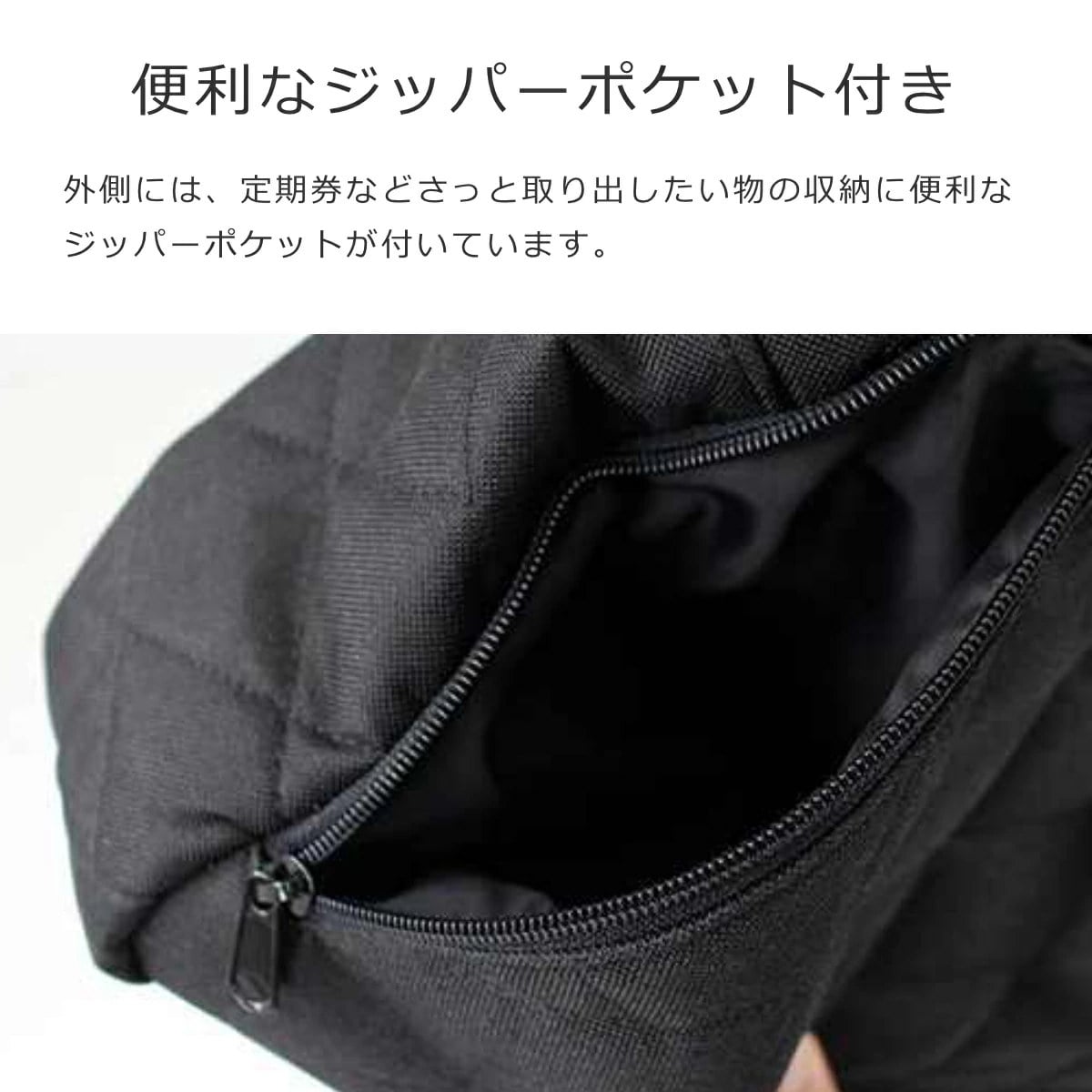 外側には、定期券などサッと取り出したい物の収納に便利なジッパーポケットが付いています。