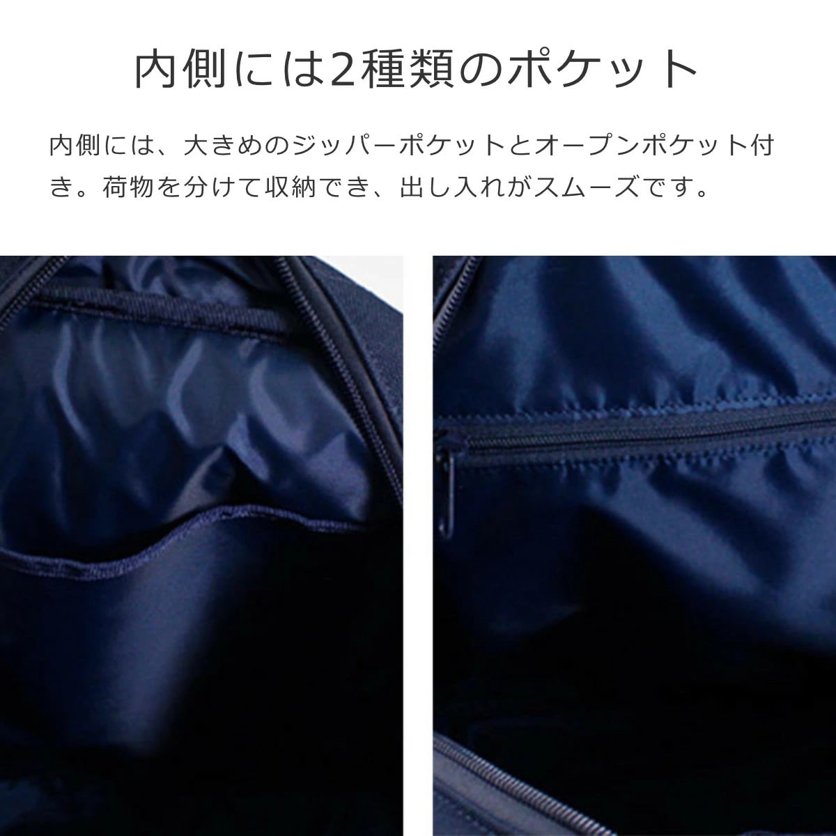 内側には、大きめのジッパーポケットとオープンポケットが付いています。荷物を分けて収納することで出し入れがスムーズにできます。