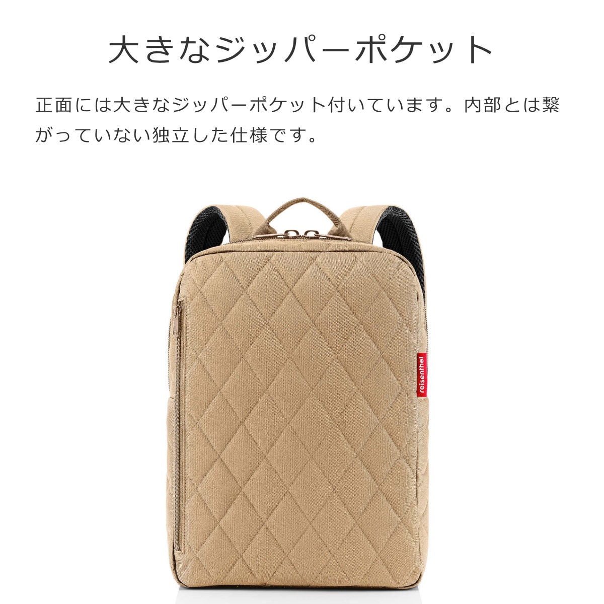正面には大きなジッパーポケット付いています。内部とは繋がっていない独立した仕様です。