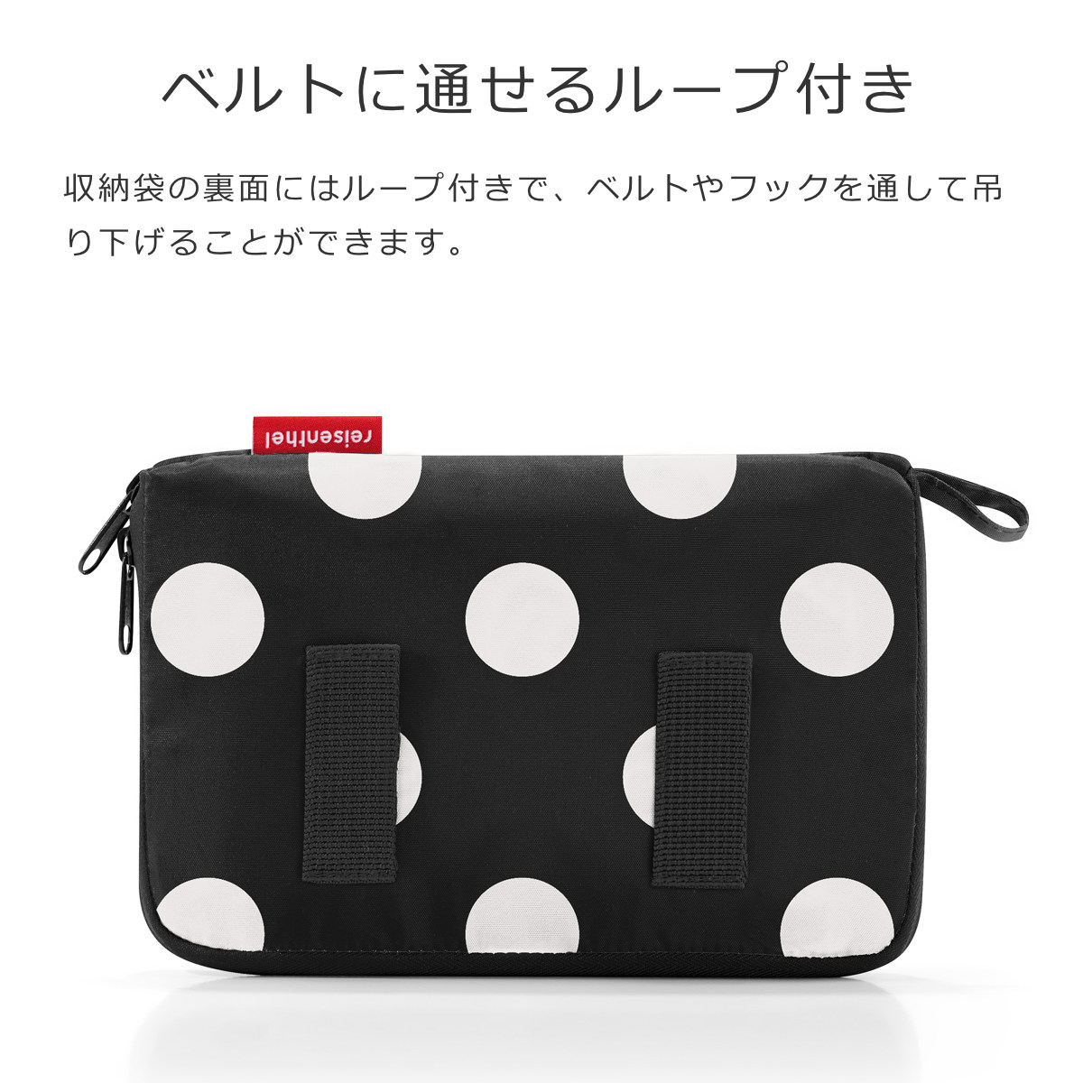 収納袋の裏面にはループ付きで、ベルトやフックを通して吊り下げることができます。