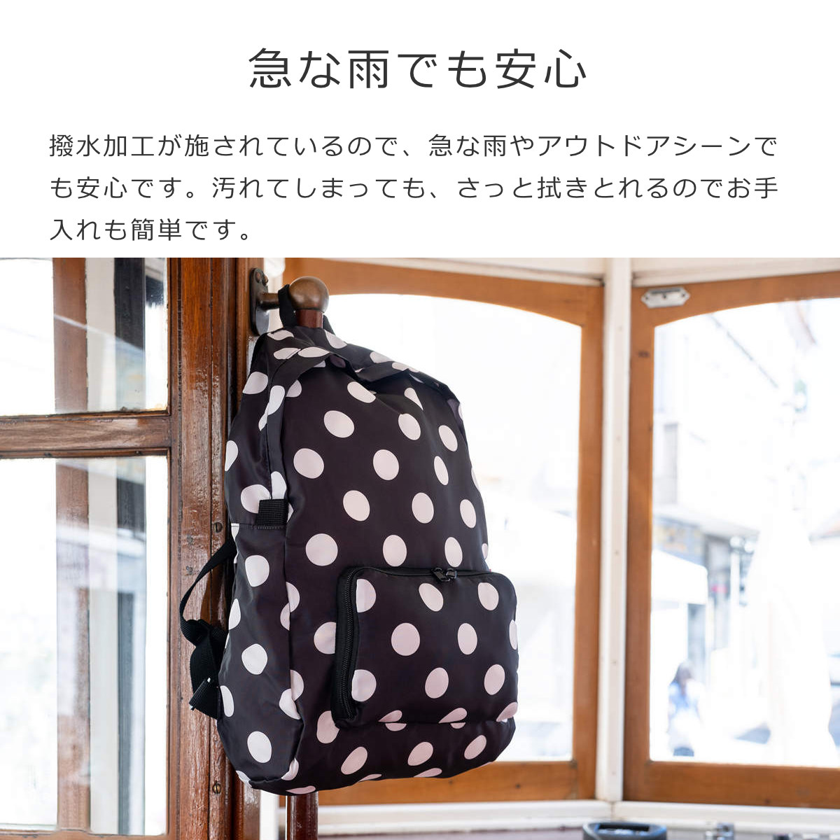 撥水加工が施されているので、急な雨やアウトドアシーンでも安心です。汚れてしまっても、さっと拭きとれるのでお手入れも簡単です。