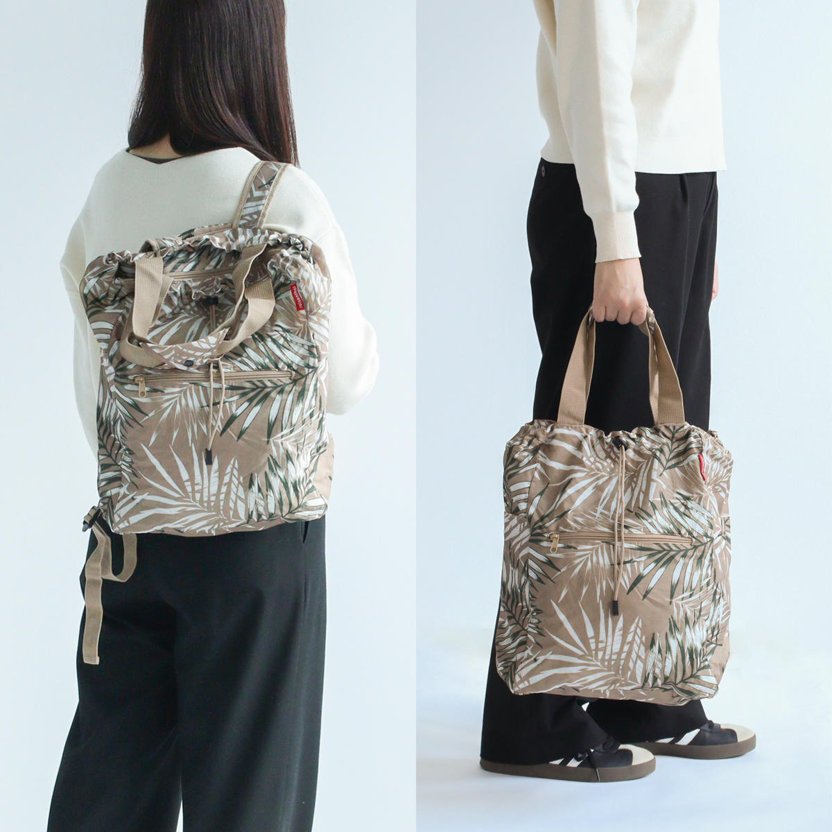リュックとしてもトートバッグとしても使える2way仕様のバッグです。自転車に乗る時や両手を空けたい時はリュックに、荷物が少ない時はトートバッグにとシーンに合わせて使い分けられます。通勤・通学や旅行用のサブバッグとして、エコバッグなどマルチに活躍します。