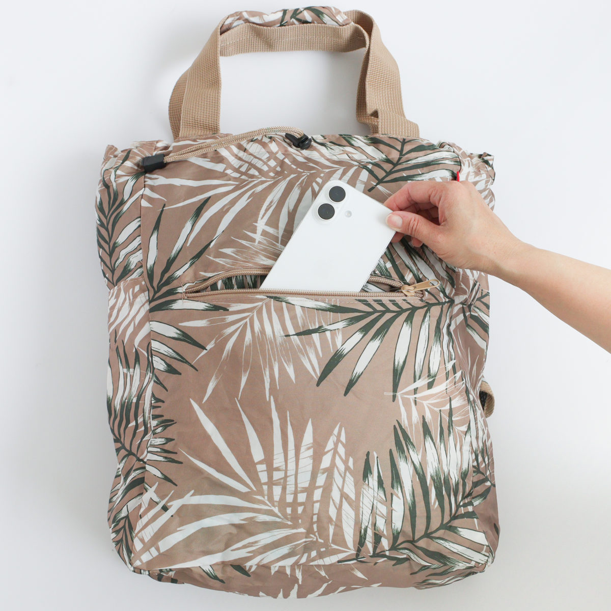 前面ポケットは、スマホなどよく出し入れする小物の収納に便利です。収納時にはこのポケットをひっくり返せば、収納袋として使えます。収納袋一体型で収納袋を無くす心配もありません。
