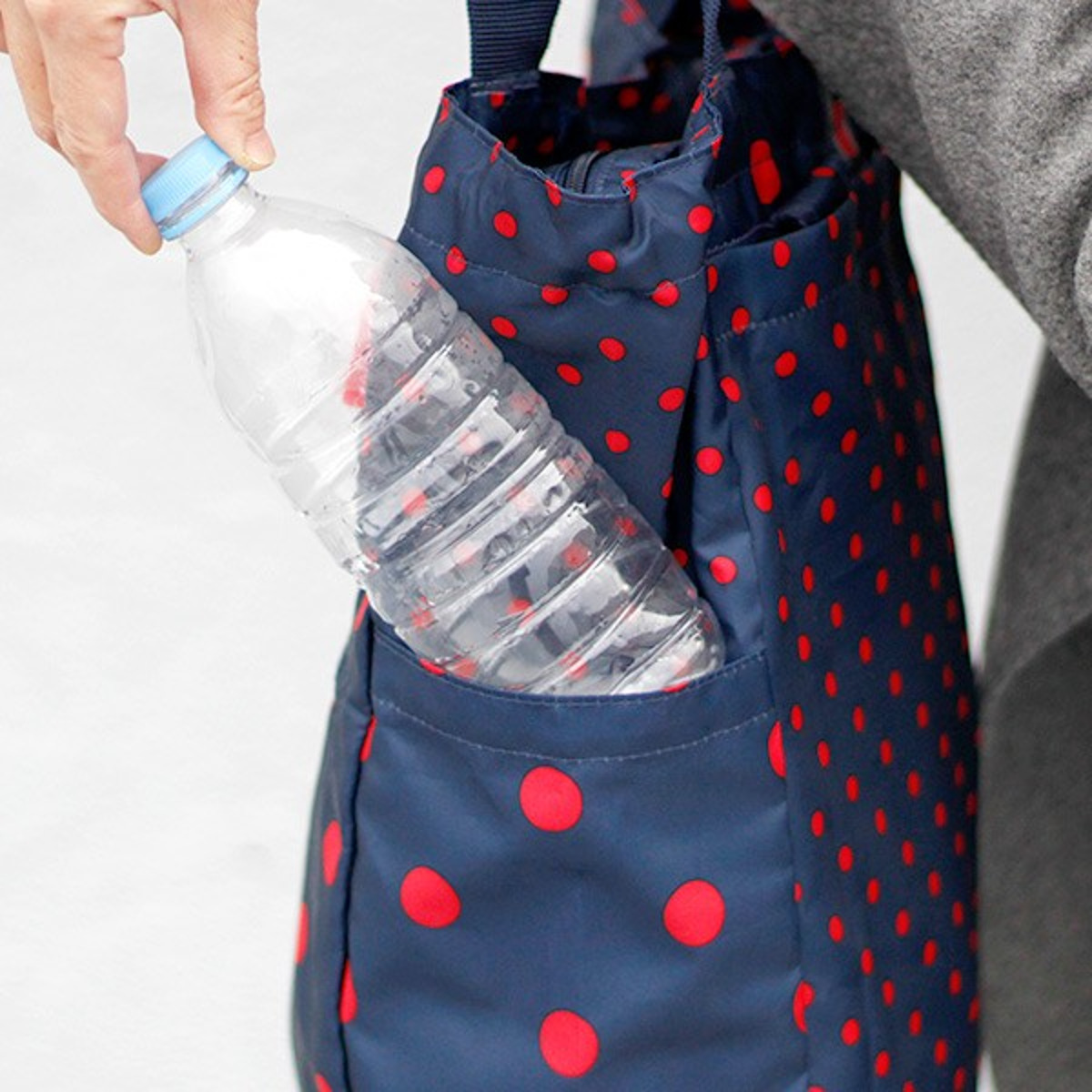 両サイドにはオープンポケット付きで、ペットボトルや折りたたみ傘を収納することができます。