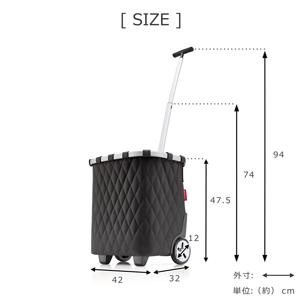 | サイズ | 外寸:約 幅42×奥行32×高さ47.5(cm) 内寸:約 幅38.5×奥行27×高さ37(cm) ハンドル使用時:約 幅42×奥行45×高さ94(cm) 車輪:約 直径12(cm) |