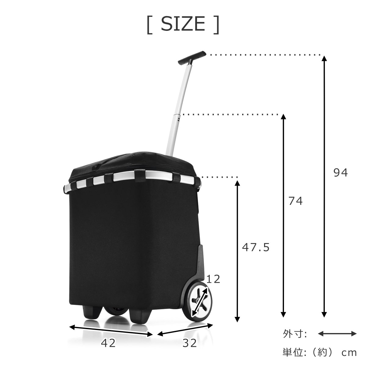 | サイズ | 外寸:約 幅42×奥行32×高さ47.5(cm) 内寸:約 幅38.5×奥行27×高さ37(cm) ハンドル使用時:約 幅42×奥行45×高さ94(cm) 車輪:約 直径12(cm) ショルダー最長:126(cm) |