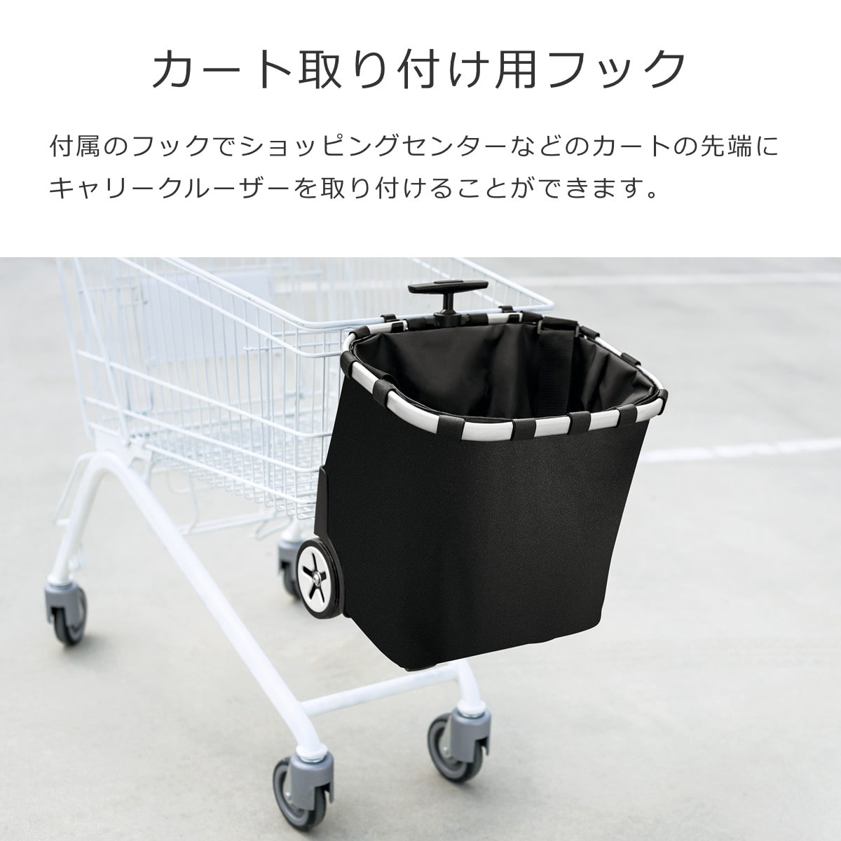 付属のフックでショッピングセンターやスーパーのショッピングカートの先端にキャリークルーザーを取り付けることができます。