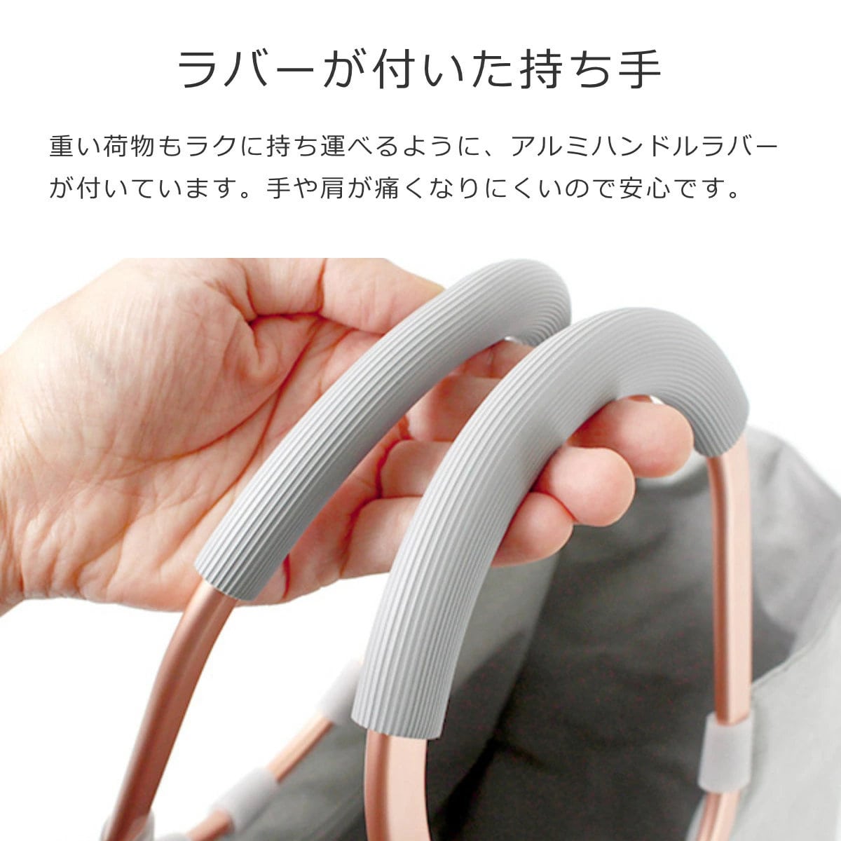 アルミハンドルにはラバーが付いており、手や肩が痛くなりにくい仕様です。重い荷物もラクに持ち運べます。
