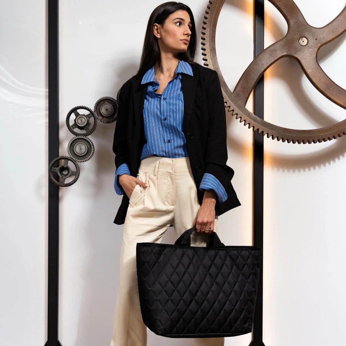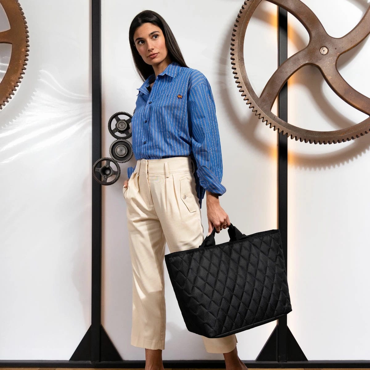 ダイヤモンド技法が施された立体的なキルティングデザインが特徴のトートバッグです。異なる生地層で構成されていて、一目見ただけでその品質の高さがわかります。