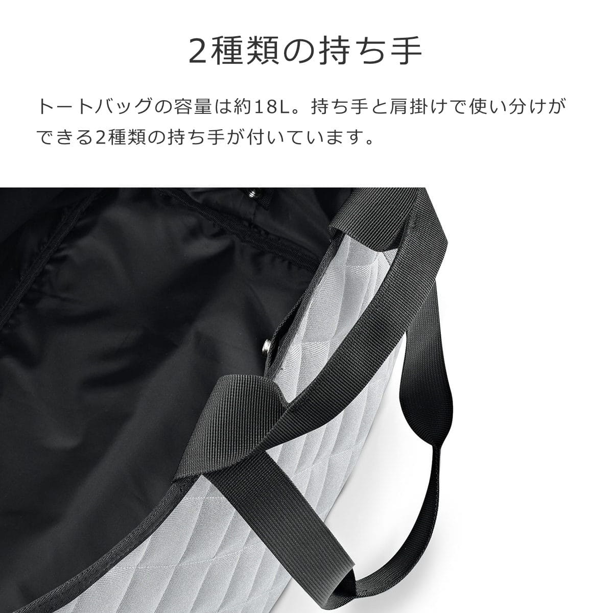 トートバッグの容量は約18Lです。持ち手と肩掛けで使い分けができる2種類の持ち手が付いています。